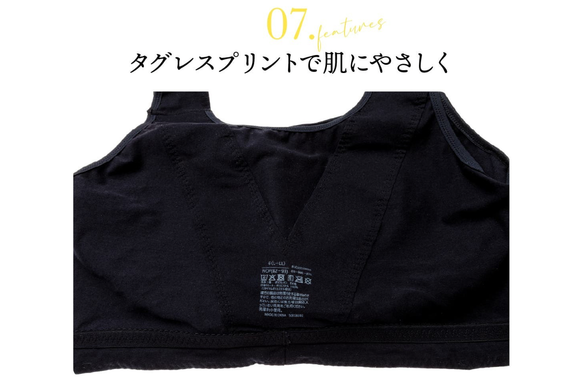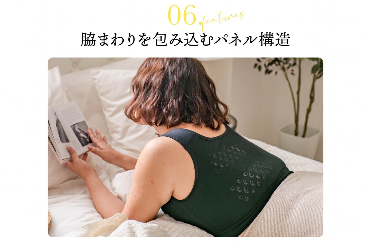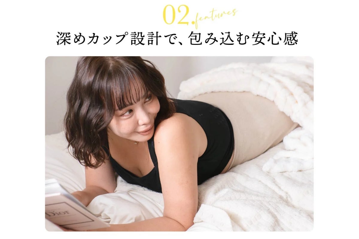 そんな考えのもと、締めつけ感を抑えながらも、ノンワイヤーでは不安になりやすいバストを、やさしく包み込む設計を目指しました。