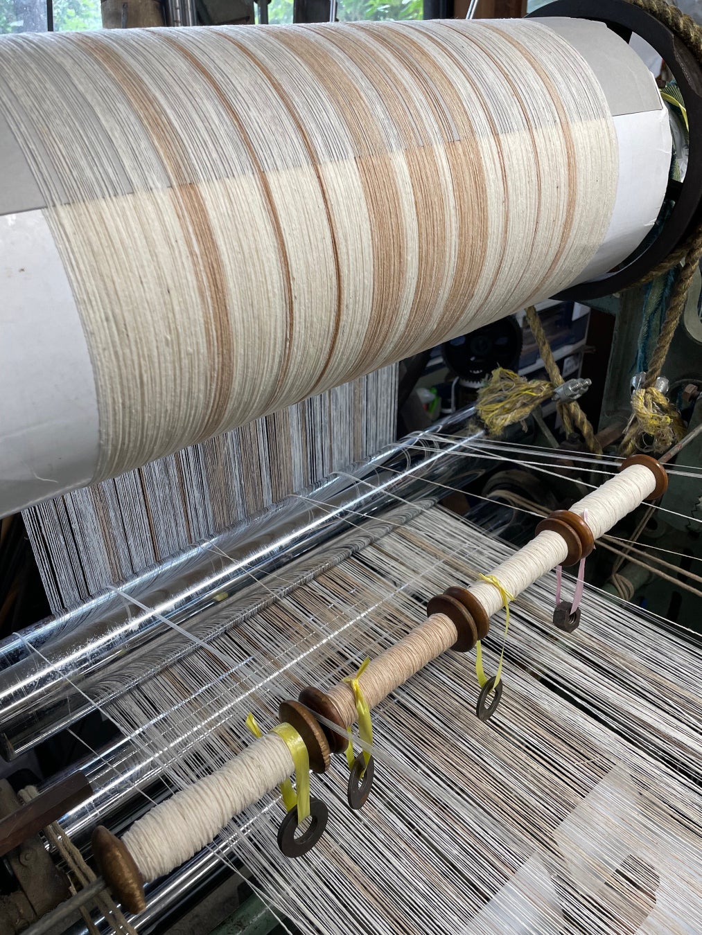 ・世界的にも希少価値の高い旧式のシャトル織機は最新の高速織機にくらべて糸に負荷をかけずに織り上げる。生地にふくらみがあり手紡ぎの特徴を損ねることなくやさしくふっくらとした風合いに仕上がっている。