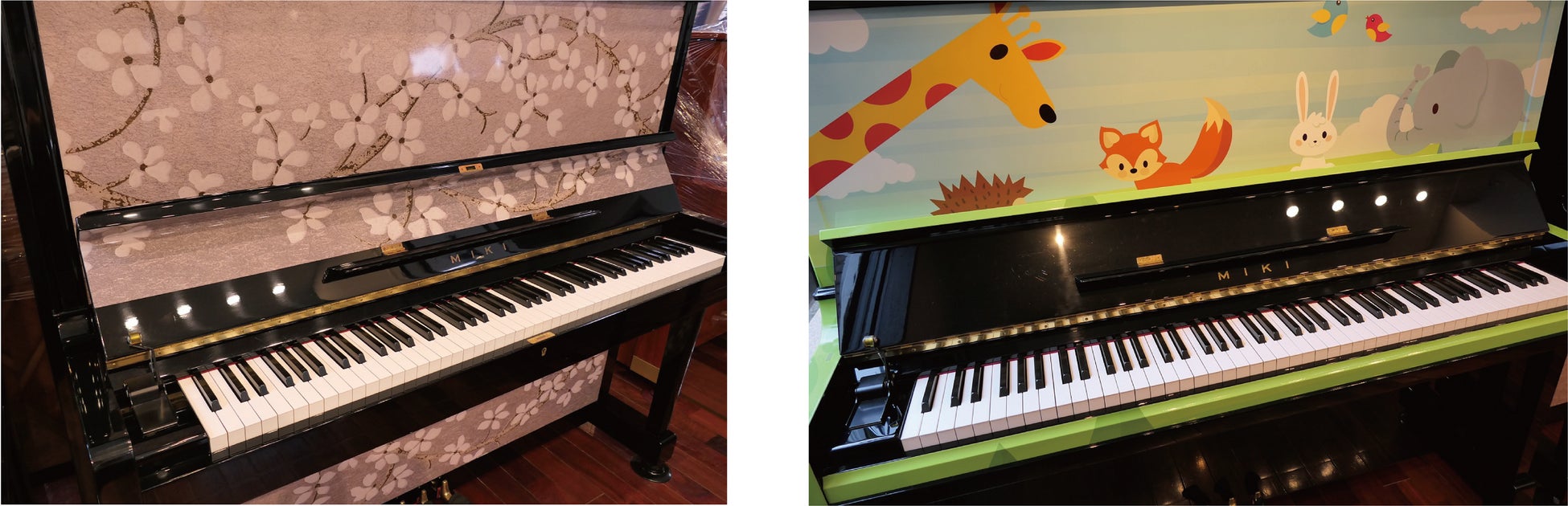 1978年・1988年製の MIKIピアノ(※2)。 当社のピアノ再生工房「三木楽器ピアノアトリエ」で再生、壁紙やファブリックでデコレーションし、2017年~2023年までストリートピアノとして活躍、施設やイベントで親しまれた2台で、サクラ柄・動物柄ともにインテリアとしても楽しんでいただける貴重なピアノです。