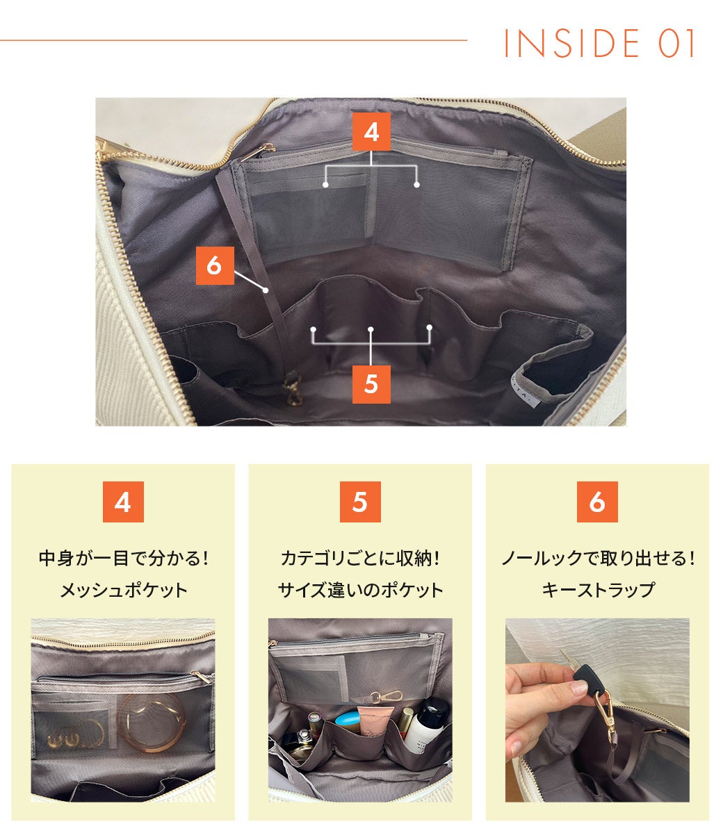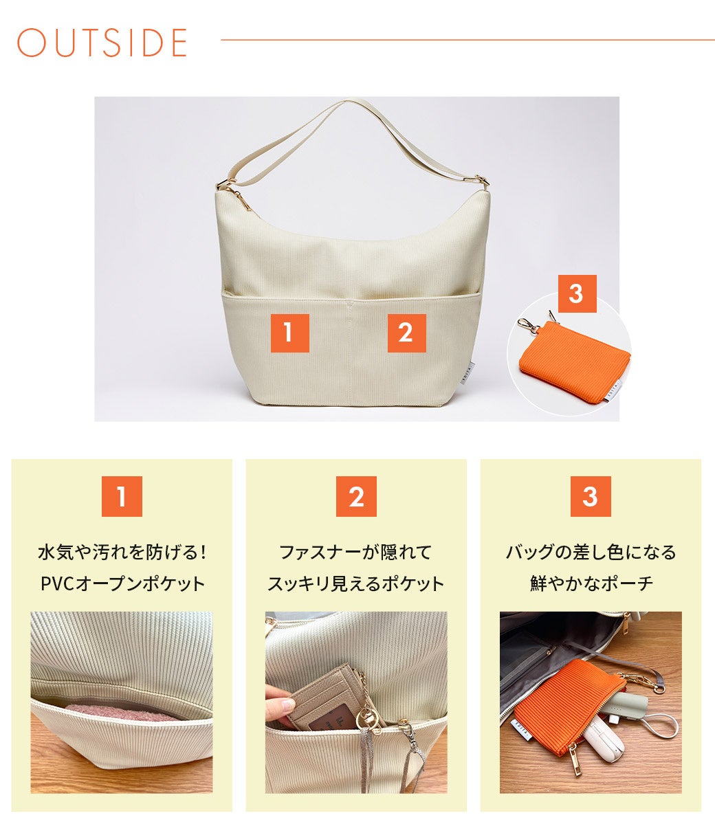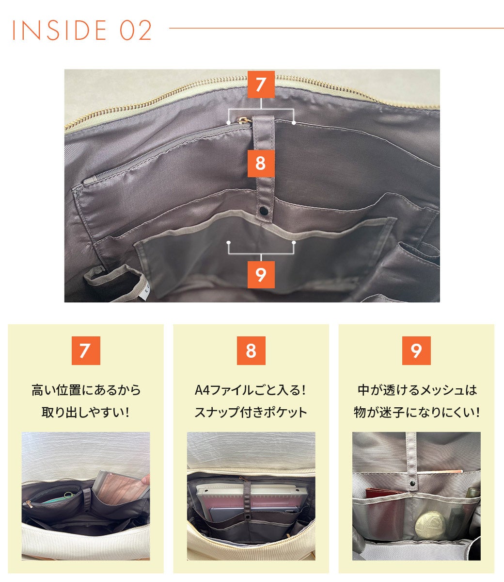 整理収納アドバイザーならではの視点を反映させた14か所のポケットは、日常使いや旅行など様々なシーンでユーザーをサポート、利便性を極限まで高めてくれます。