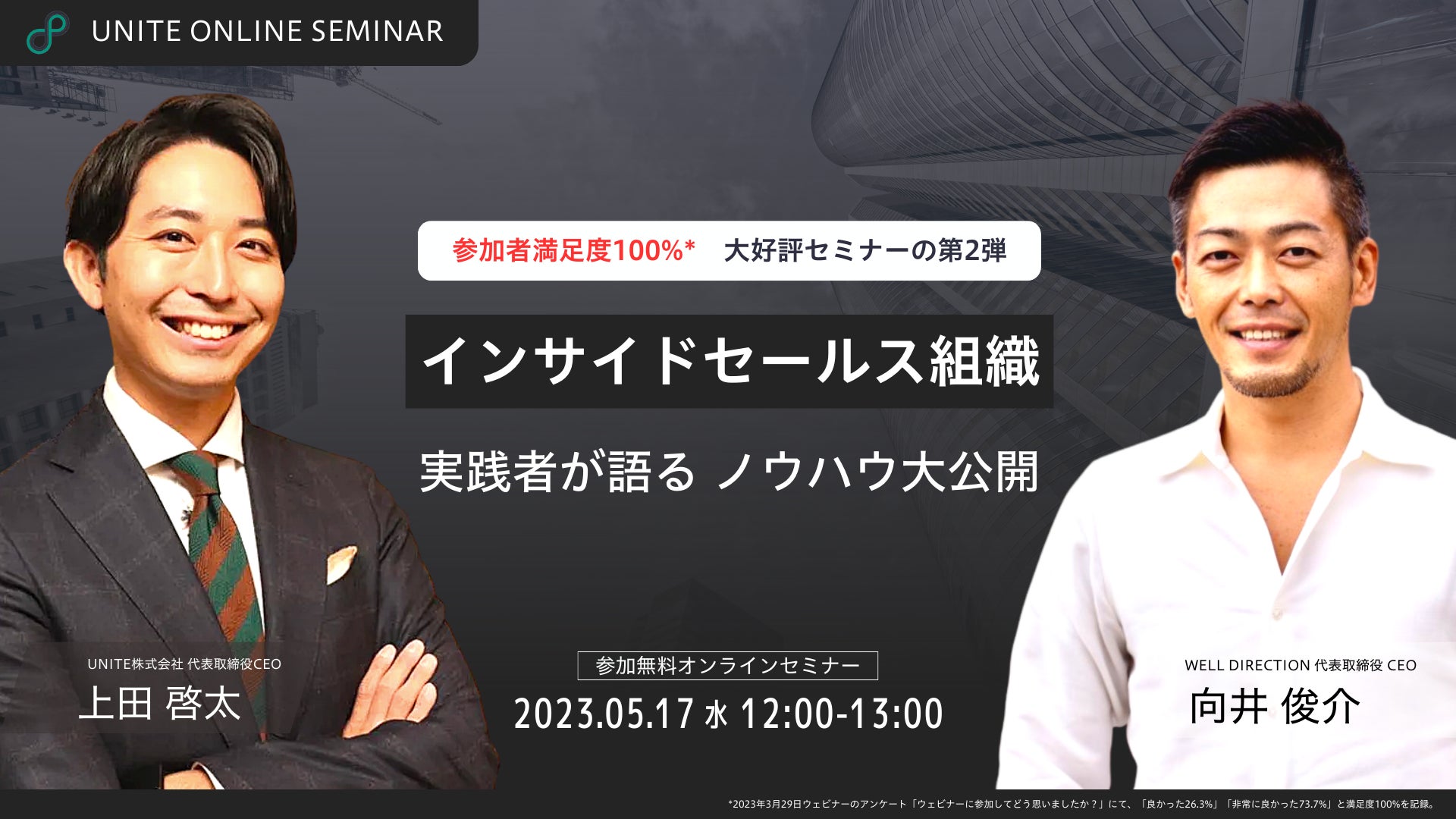 ウェルディレクションCEOの向井俊介氏を招いて実施するセミナーの第2弾企画。本セミナーでは、「インサイドセールス組織 実践者が語るノウハウ大公開」というテーマで、インサイドセールスにまつわる疑問に対して、「長期的に強い組織・ビジネスを作るための本質的なアドバイスを行うウェルディレクションCEOの向井俊介氏」と「インサイドセールス組織の立ち上げ支援を行うUNITE株式会社CEOの上田啓太氏」がお答えします。