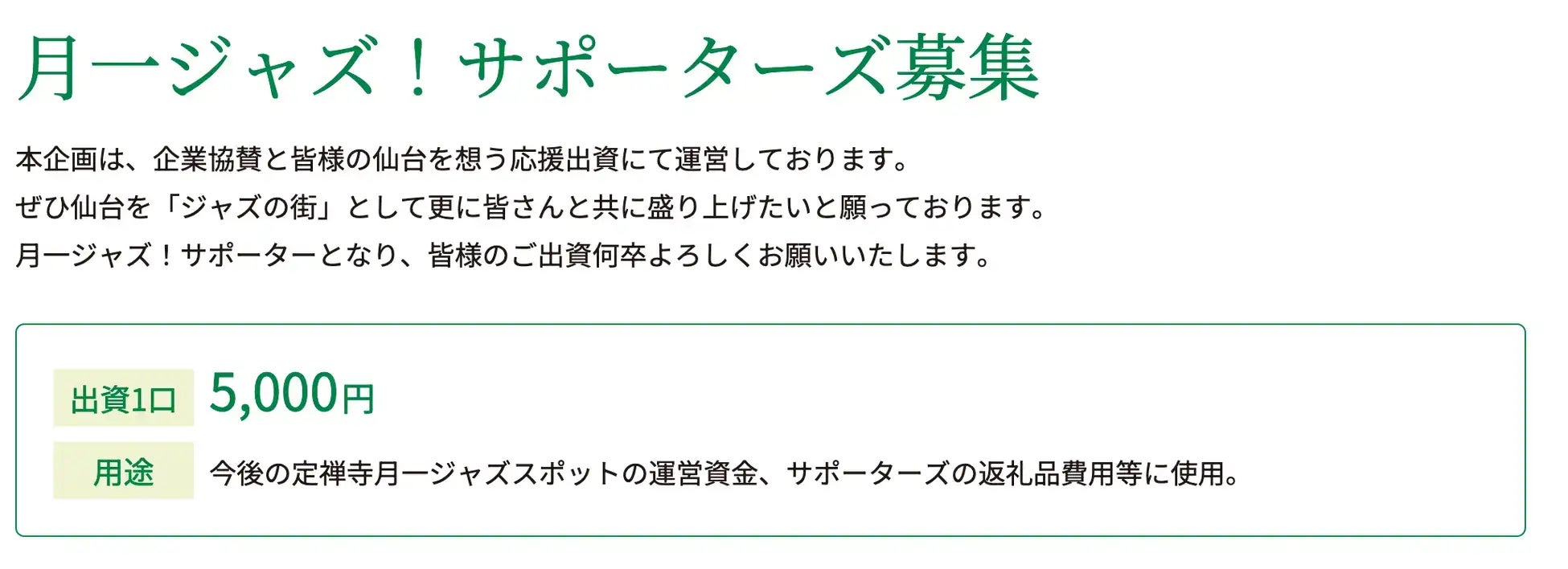 本企画では、仙台をジャズで盛り上げたいと思う個人の皆様からの出資も募っている。