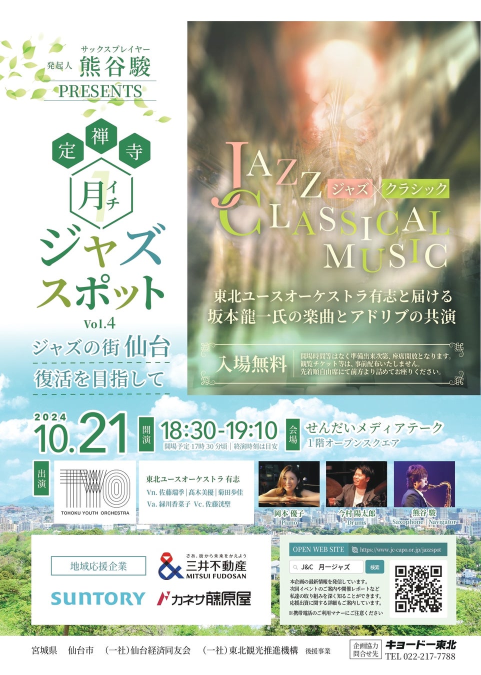 今年度最後の開催!「定禅寺月一ジャズスポット」を締めくくるステージは、ジャズxクラシック!坂本龍一氏が創設したオーケストラも出演!発起人 熊谷 駿