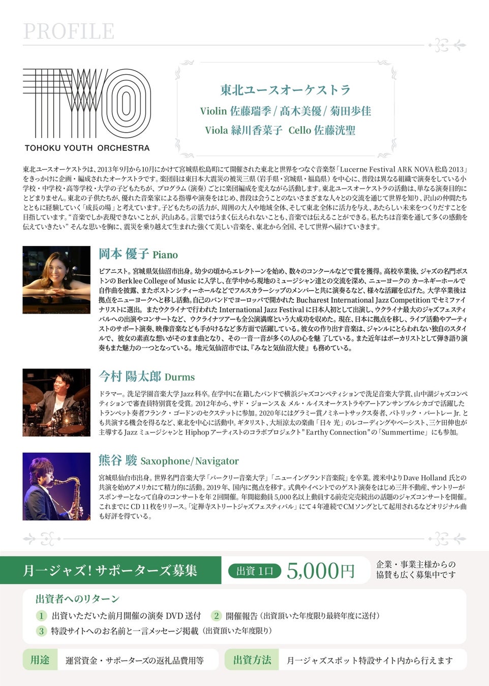 本企画のコンセプトである「音楽で仙台の賑わい創出」、東北ユースオーケストラの「東北の復興を音楽で表現する」というコラボレーションは、今年度最後の定禅寺月一ジャズスポットを締めくくる壮大なステージとなることだろう。