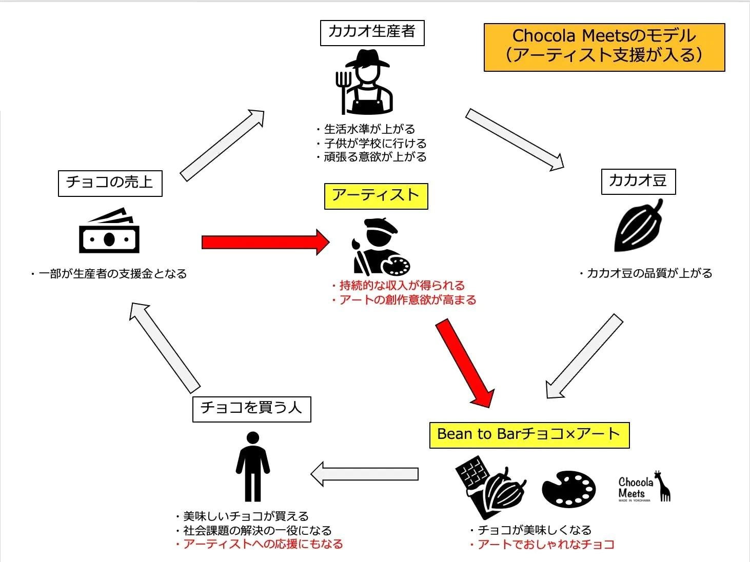 売上ごとにカカオ農園・パッケージを描くアーティストにも利益が還元されるビジネスモデルを採用し、お客さま・ブランド・製造に携わるカカオ生産者やアーティスト、全ての人が幸せになるブランドを目指しています。
