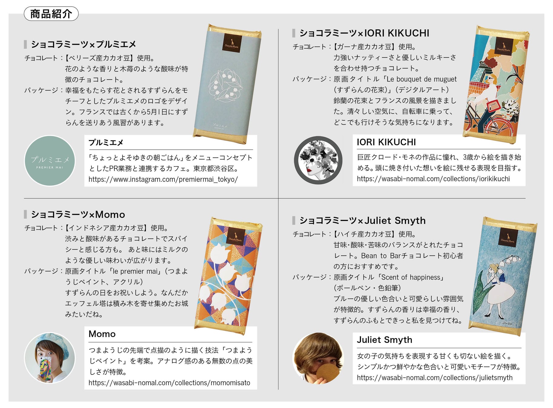 クラフトチョコレートブランド「Chocola Meets」は、世界各国から仕入れた産地ごとに個性が異なるカカオ豆を原料とし、チョコレートになるまでの製造過程を自社で手掛けることで個性を感じる味わいのチョコレートを製造しております。またテーマに沿ってアーティストにより描かれた作品をあしらった個性的なパッケージが特徴です。この度、“ちょっとよそゆきの朝ごはん”を提供する隠れ家カフェ「プルミエメ」が2022年5月に開店一周年を迎えることをきっかけに、「プルミエメ」に関連する「すずらんとパリ」を題材としたアート作品でパッケージする企画でコラボレーションいたします。アート作品は「暮らしを、アートに」をテーマとするアート専門の通販サイト「WASABI」(東京都中野区)に所属する3名のアーティストが手掛け、「プルミエメ」のロゴである幸福を運ぶすずらんのデザインとあわせ、計4種のクラフトチョコレートを期間限定で発売すると共に、店内で展示いたします。