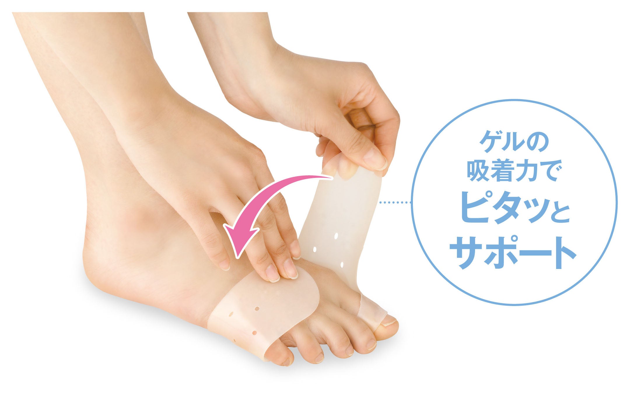 巻き付けタイプだからサイズも固定力も調節自在。ゲルの吸着力で足をピタッとサポートします。