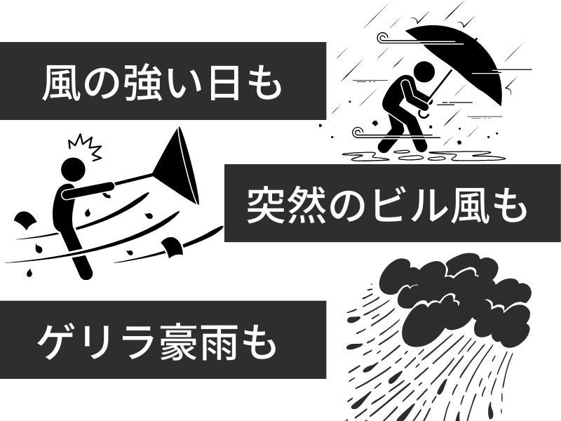 雨x暑さx強風に対応した全天候対応型の傘で、天気に左右されずに快適な通勤をお届けします。