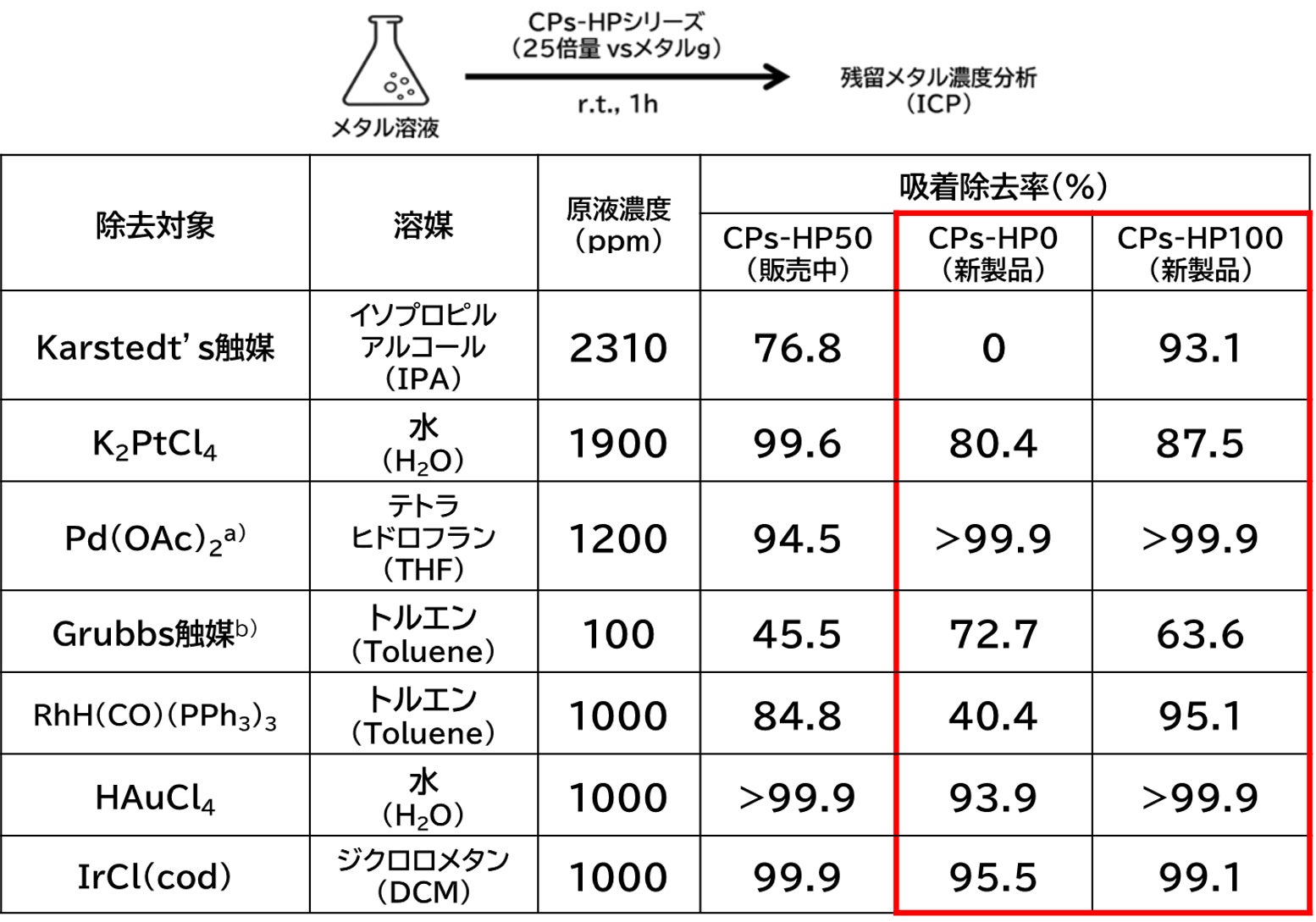 2023年12月には貴金属の価数を問わずに使用が可能なハイブリッド型スカベンジャー「CPs-HP50」の販売を開始し好評を得ております。この度、性状の異なる貴金属溶液に幅広く対応すべく、「CPs-HP50」に加え、「CPs-HP0」「CPs-HP100」の2製品をラインナップに追加しました。特に「CPs-HP0」は、貴金属に加えて重金属の吸着除去においても高い吸着性能を発揮します。