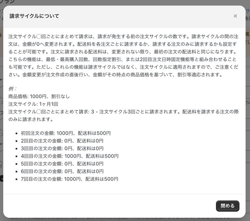 注文のサイクル何回ごとに請求するのかという数字が請求サイクルの数字になります。