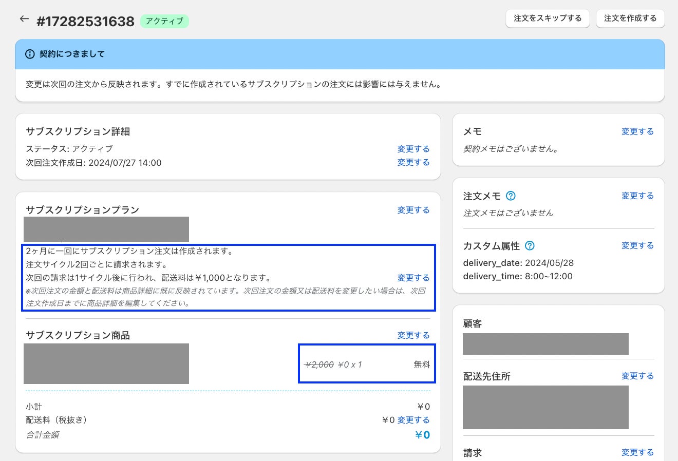 3000円の商品を1ヶ月に1回のサブスク契約した場合、毎月3000円の注文が作成される仕組みになっています。