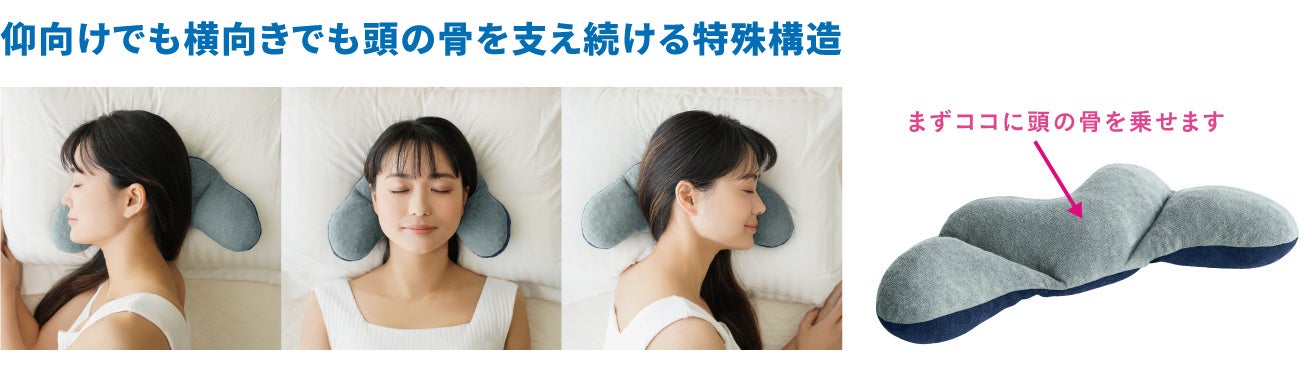 1万⼈以上の姿勢の悩みに向き合ってきた作業療法⼠野村寿⼦が、⾸や肩の緊張を緩和するための頭の重みを受け⽌めて、仰向けでも横向きでも快適な、「枕の上に置く枕」を開発。