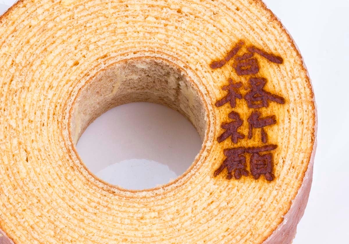 千葉県の人気バウムクーヘン専門店「せんねんの木」が製造し、合格祈願の焼き印をひとつひとつ、ていねいにお入れしています。