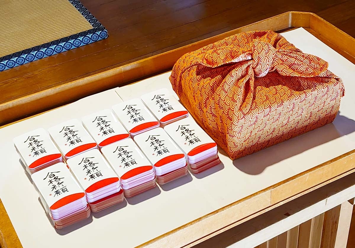 ゴウカクーヘンは木箱に納め、風呂敷にお包みして入試前のタイミングにお届けします。受験日前後にご家族皆さんで分け合い、合格を願いお召し上がりください。