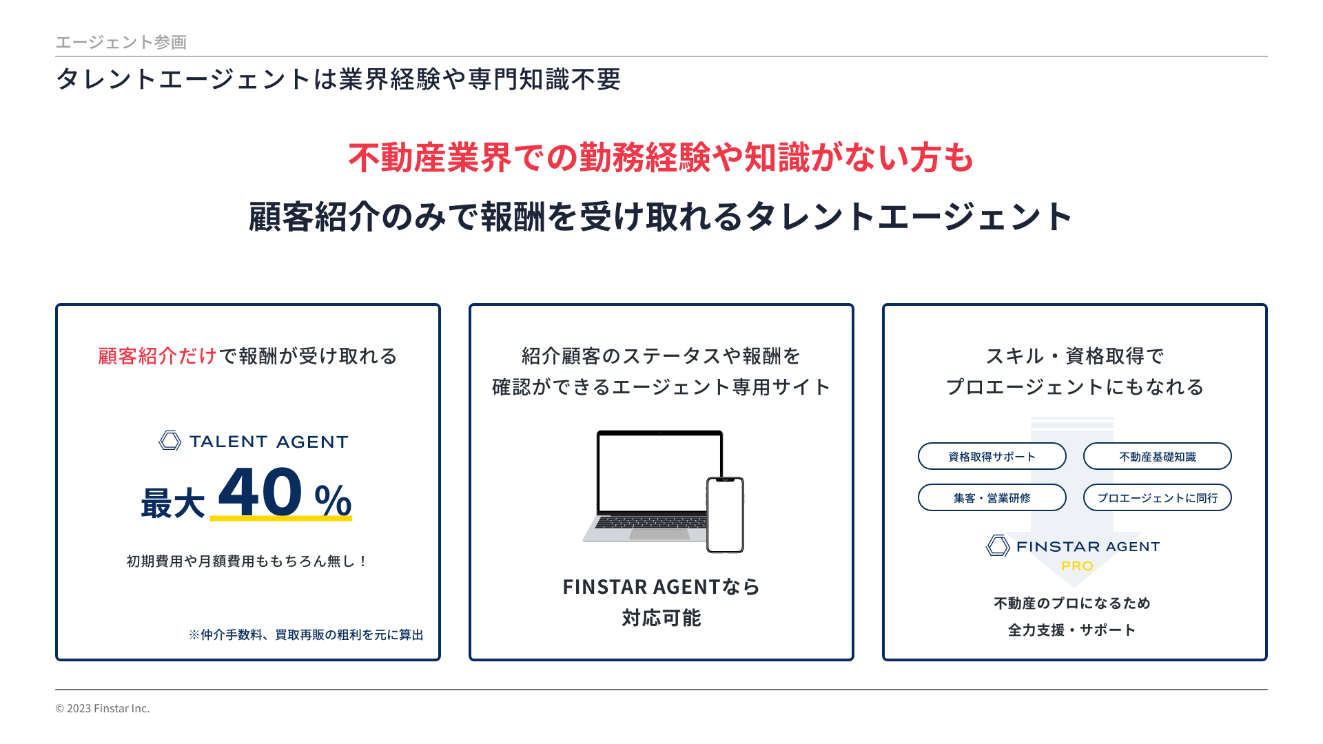FINSTAR AGENTは、不動産営業に従事する方々が顧客への提案業務に専念できる「サポート」を提供し、「自由」な提案や働き方を実現したうえで、成果に見合った「最大限の報酬」を得ることを可能にするサービスです