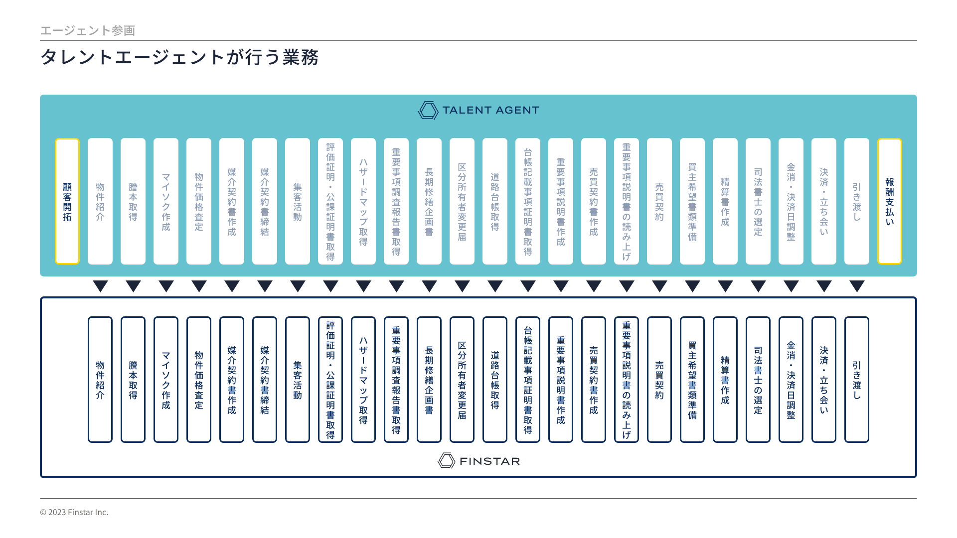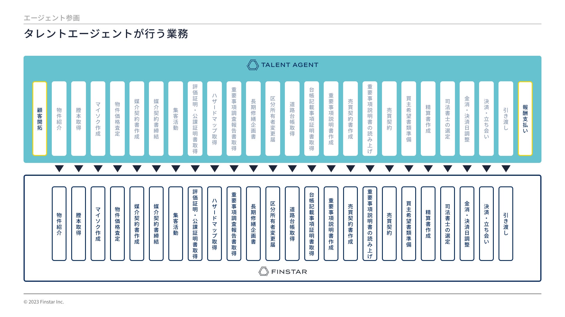TALENT AGENTが行う業務は「顧客紹介」のみとなり、不動産売買に係る媒介業務やその他実務は専門別に経験豊富なプロエージェントが担当いたします。