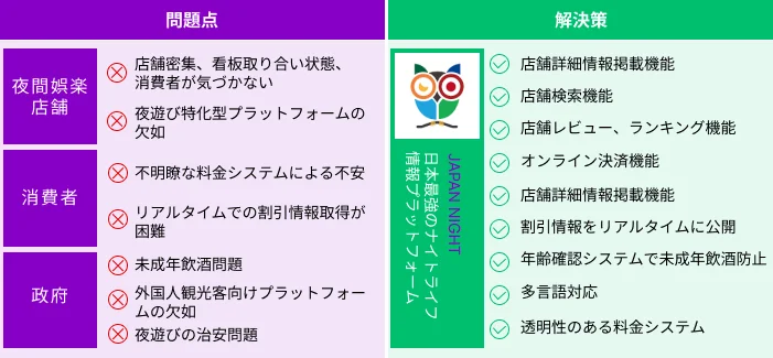 弊社はこれらの課題を解決し、世の中の人々に安心安全に夜遊びを楽しんでいただくためにアプリ「JP NIGHT」を開発いたしました。このプラットフォームアプリは、店舗の検索、予約、チケット購入、割引情報掲載などの機能を統合しております。英語、中国語、韓国語、日本語の多言語対応もしており、訪日外国人の方が夜遊び情報を簡単に検索し、閲覧することができます。日本で最も有力なナイトタイム店舗情報を国内外の消費者に紹介することで、より商業的な価値を生み出します。