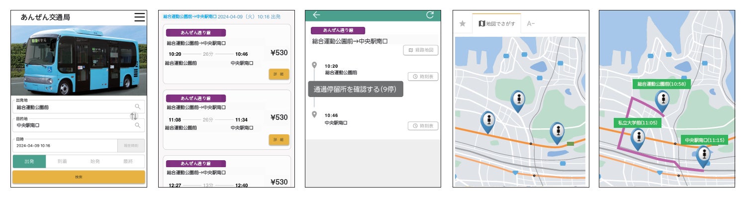 出発地・目的地・日時を指定して、条件に合う便を検索し、該当の便の運行状況を確認できます。便を指定し、より詳細な情報(車両の現在位置、到着予定時刻など)の表示も可能です。よく使うバス停を記録しておく機能、バス停を地図から探す機能、多言語対応など、利用者の使いやすさにこだわったUIを採用しています。