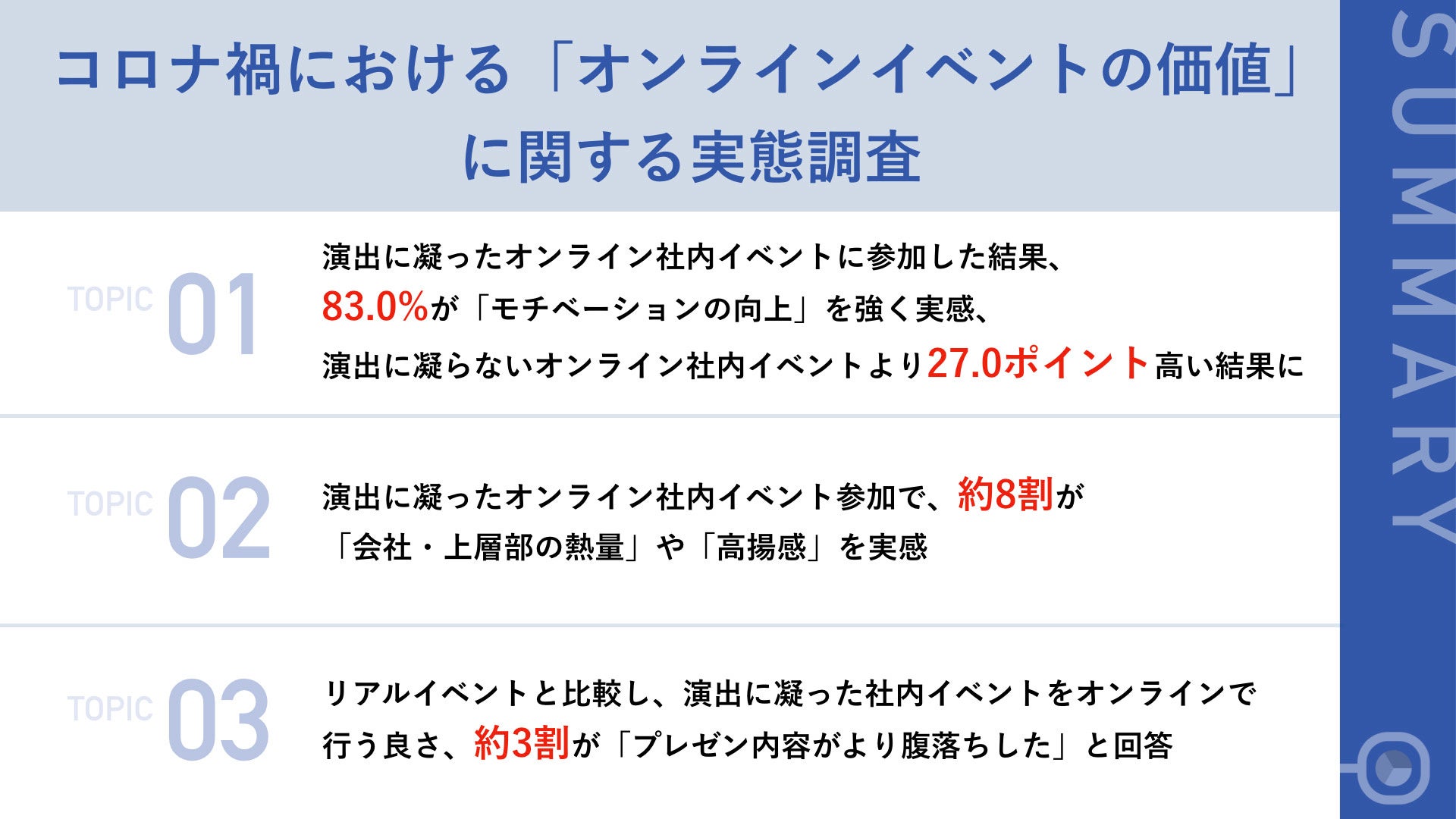 - 演出型オンライン社内イベントに参加した結果、83.0%が「モチベーションの向上」を実感、非演出型オンライン社内イベントのより27.0ポイント高い結果に