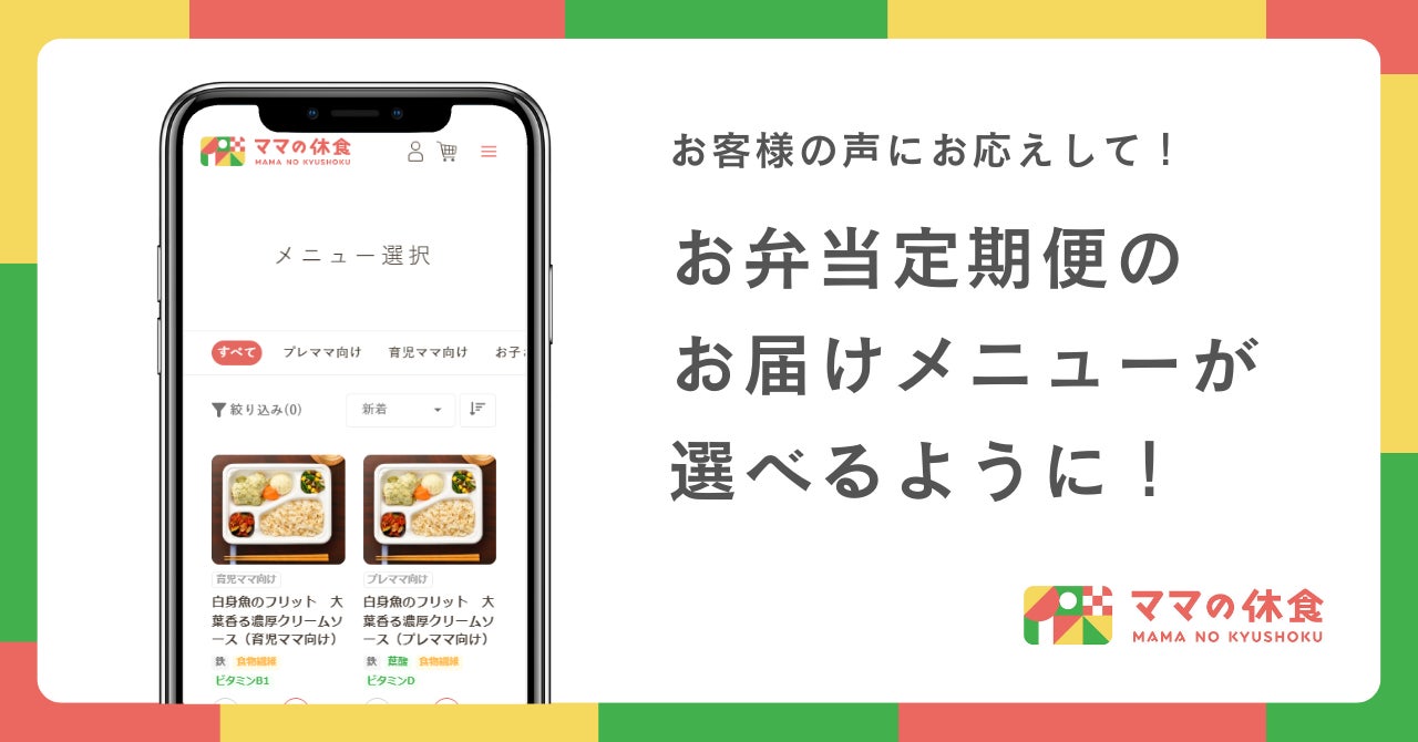 株式会社MYPLATE(本社:東京都渋谷区、代表取締役:川端史紀)が運営する、“ママに休養と栄養を届ける”宅食サービス「ママの休食(ままのきゅうしょく)」は、6月23日(木)より、お届けメニューをお選びいただける機能を、ママの休食をご愛顧いただいているお弁当定期便のお客様に先行して提供いたします。従来のお届けメニューをママの休食がお選びする形態と合わせ、お客様の用途やお好み・ライフスタイルに応じた柔軟なサービスのご提供が可能になります。