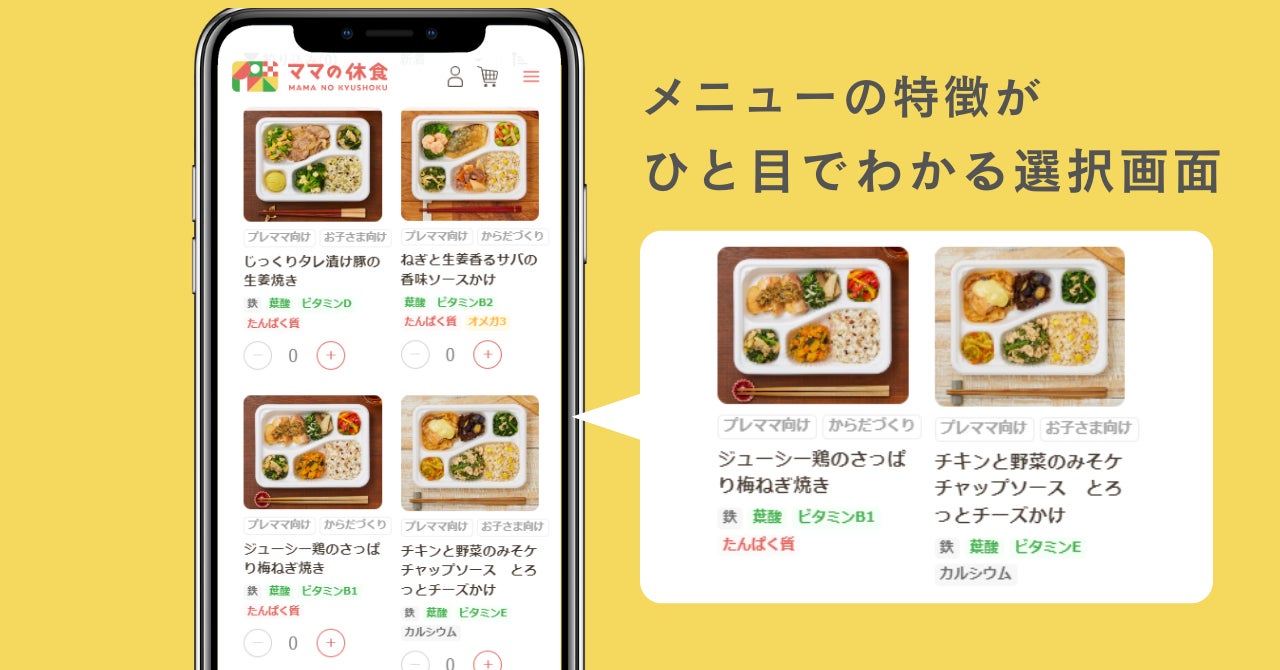 また、栄養素の特徴のみでなく、メニューごとにどのライフステージの方におすすめかをママの休食がレコメンド。迷ったときは「プレママ向け」「育児ママ向け」「お子さま向け」「からだづくり」からご自身のライフステージにあわせてお選びいただけます。