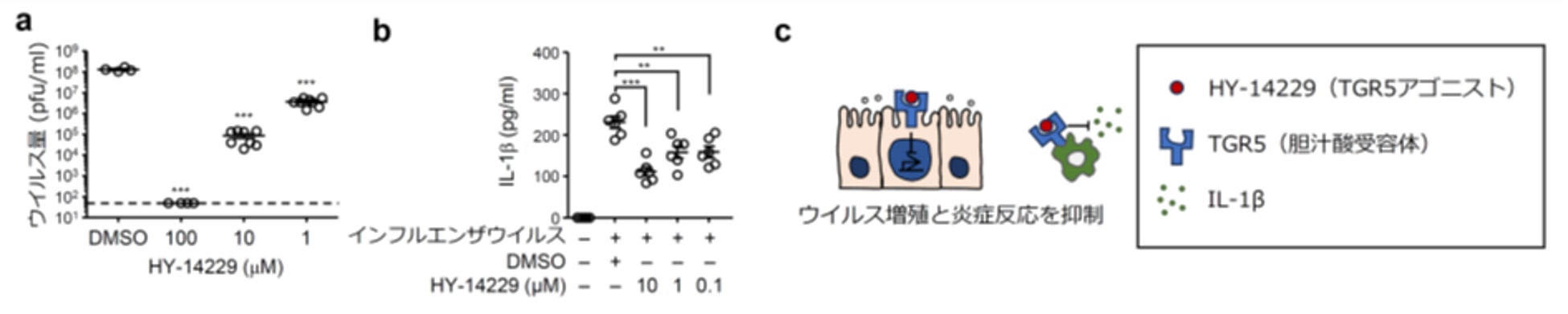 (a)MDCK細胞にインフルエンザウイルスを感染させ、TGR5アゴニスト(HY-14229)存在下で24時間培養した。24時間後の培養上清中のウイルス量をプラークアッセイ法で測定した。(b)マウス骨髄マクロファージにインフルエンザウイルスを感染させ、TGR5アゴニスト(HY-14229)存在下で24時間培養した。24時間後の培養上清中のIL-1β量をELISAで測定した。(c)TGR5アゴニスト(HY-14229)はインフルエンザウイルスの増殖およびウイルス感染により誘導される炎症反応を抑制していると考えられた。