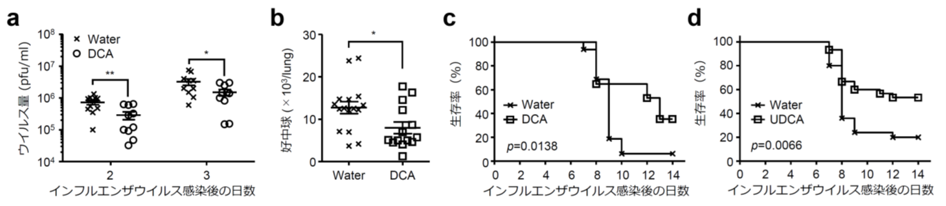 次に22℃飼育条件下のマウスに通常の水道水またはデオキシコール酸(DCA)やウルソデオキシコール酸(UDCA)を混ぜた水道水を与え、インフルエンザウイルスを経鼻的に感染させました。するとDCAやUDCAを与えたグループでは、肺のウイルス量や好中球(注2)の数が減少し(図4a,b)、インフルエンザウイルス感染後の生存率が有意に改善することが分かりました(図4c,d)。