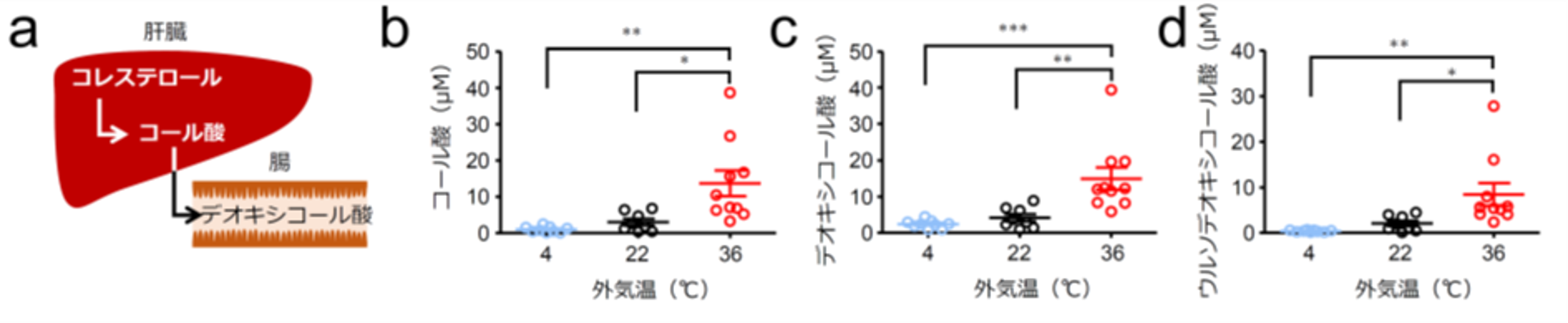 (a)デオキシコール酸の合成経路。コレステロールを材料に肝臓で一次胆汁酸(コール酸など)が合成される。一次胆汁酸が腸へ分泌されると腸内細菌の働きにより二次胆汁酸(デオキシコール酸など)へ変換される。(b,c) 4℃、22℃、36℃条件下で7日間飼育したマウスの血清のメタボローム解析を行った。(b)コール酸濃度。(c)デオキシコール酸濃度。(d)ウルソデオキシコール酸濃度。〇印はそれぞれのマウスの値を表す。