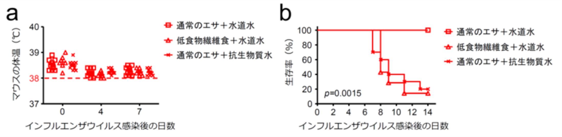 この仮説を検証するため、通常のエサと水道水を与えたコントロールグループ、低食物繊維食と水道水を与えた低食物繊維食グループ、通常のエサと抗生物質を混ぜた水道水を与えた抗生物質グループに分け、このマウスを36℃条件下で飼育したあと、インフルエンザウイルスを経鼻的に感染させました。するとどのグループもウイルス感染前後の体温は38℃以上に保たれていたものの(図2a)、低食物繊維食グループや抗生物質グループはインフルエンザウイルス感染に対する抵抗力が失われていることが分かりました(図2b)。