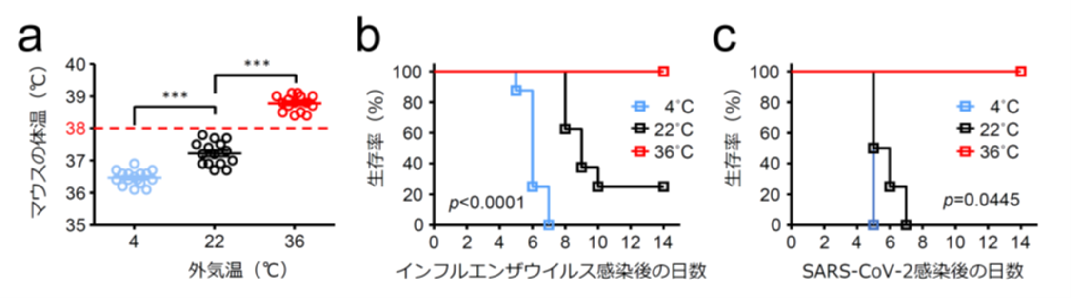 (a)マウスを各温度条件下で飼育して、ウイルスを感染させる前のマウスの基礎体温を測定した。〇印はそれぞれのマウスの値を表す。(b,c)各温度条件で飼育したマウスにインフルエンザウイルス(b)またはSARS-CoV-2(c)を感染させ、感染14日後までの生存率を観察した。