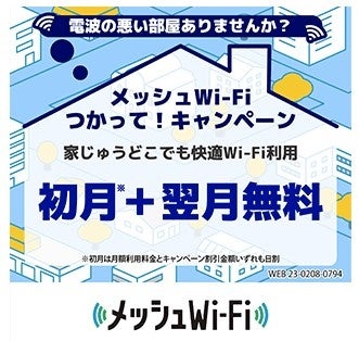 オプションサービスのメッシュWi-Fiを新規でご加入いただき、適用条件を全て満たした場合に、課⾦開始⽉及びその翌⽉のメッシュWi-Fiの⽉額利用料⾦を、無料とするキャンペーンです。
