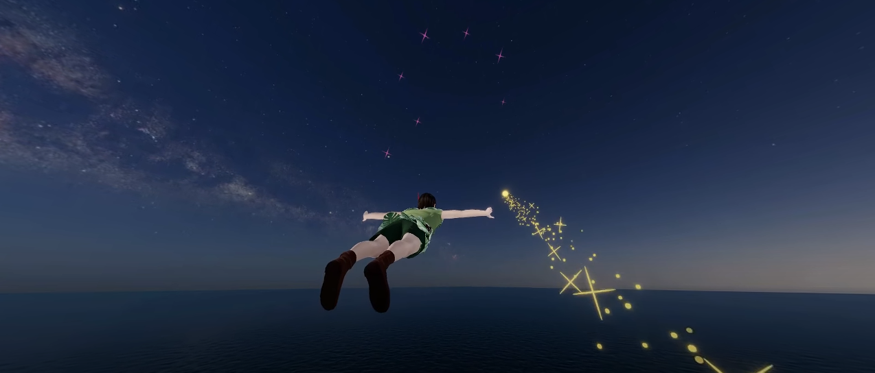 40年以上続く舞台の観覧者への試みとして、VR映像をスマートフォンで視聴したいとの要望を受け、ストーリーボードから制作。ピーター・パンの家で妖精の粉をまとったら夜のロンドンへ飛び立ち、海を渡り夜明けのネバーランドへピーター・パンとティンカー・ベルと共に飛んでゆく。