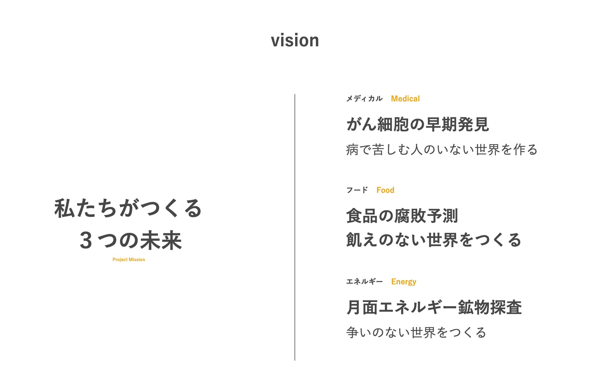 月面探査機「かぐや」に搭載されたハイパースペクトルカメラのコア技術を応用し、高精度な鮮度診断を通じて食品ロスの削減を目指すビジネスプランで、本プログラムへの応募に至りました。