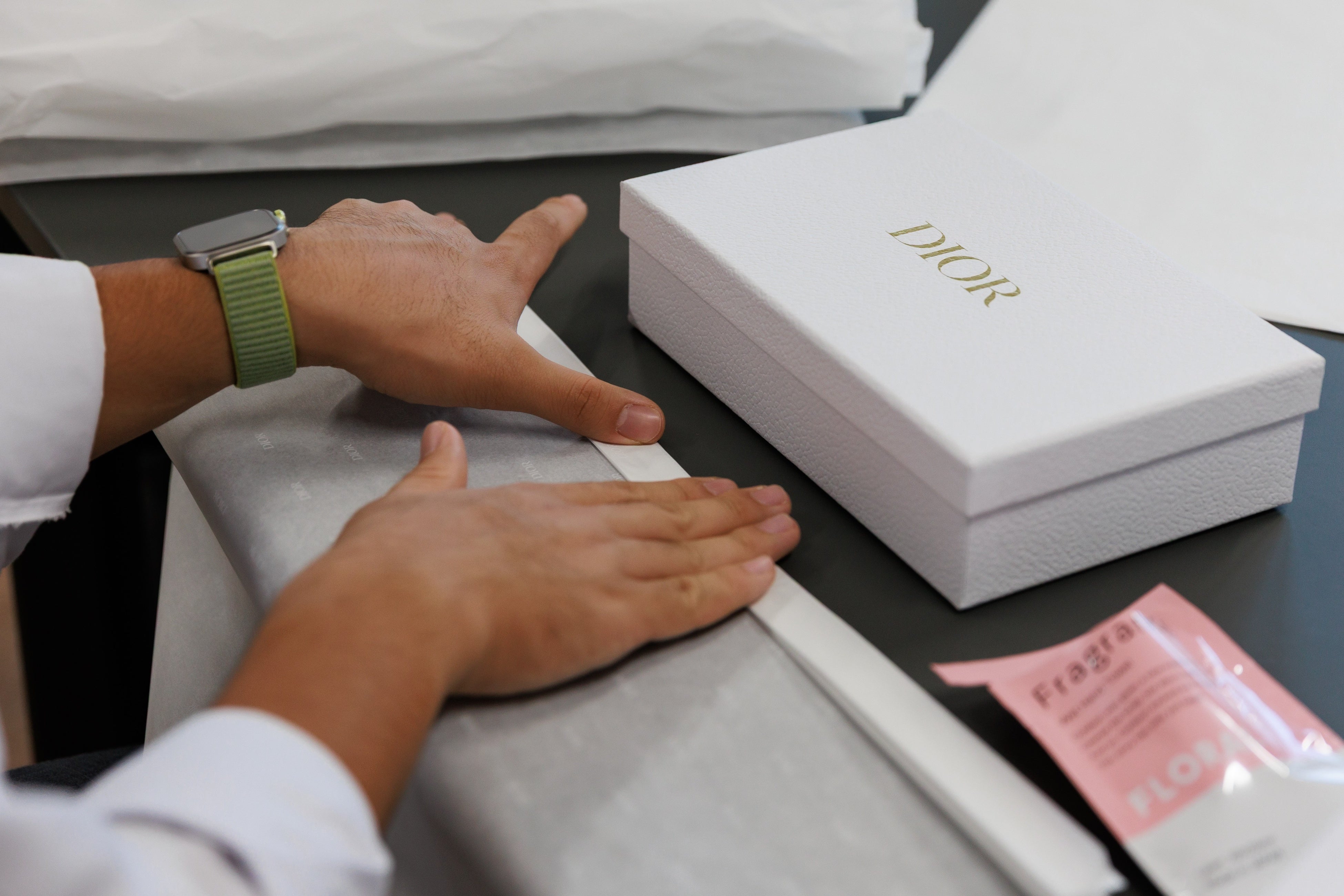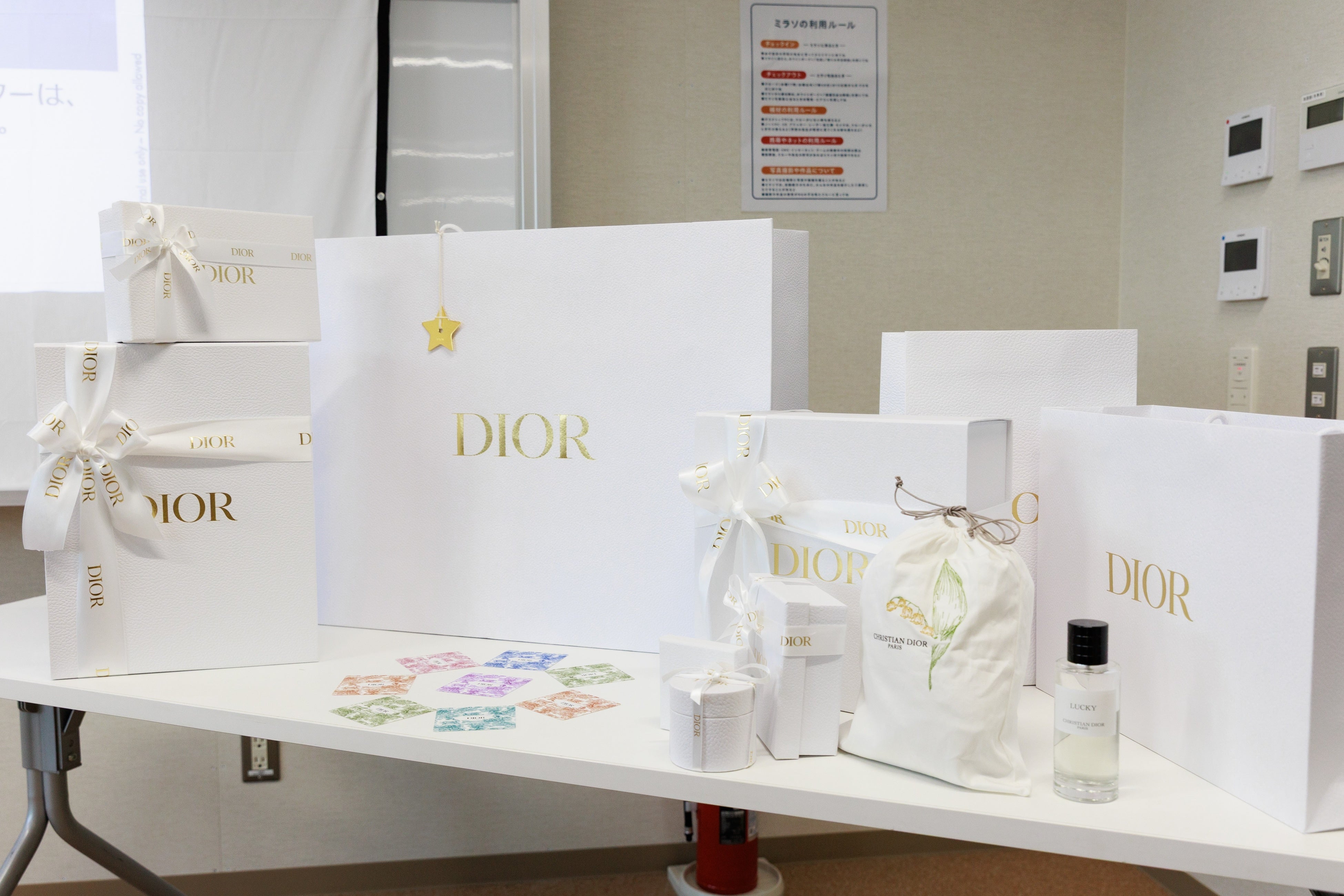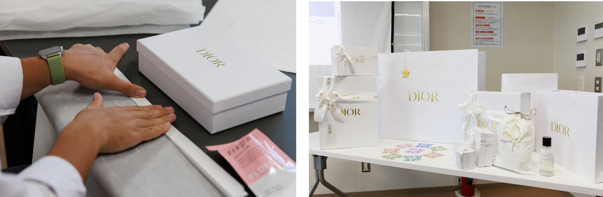 ディオール: アート オブ ギフティング体験。ディオールのサヴォアフェールを感じるギフトの芸術を学び、創設者クリスチャン・ディオールの想いを探究。フレンチエレガンスの世界を体験しながら、大切な方への想いをメッセージカードに込めてギフトボックスを完成させました。
