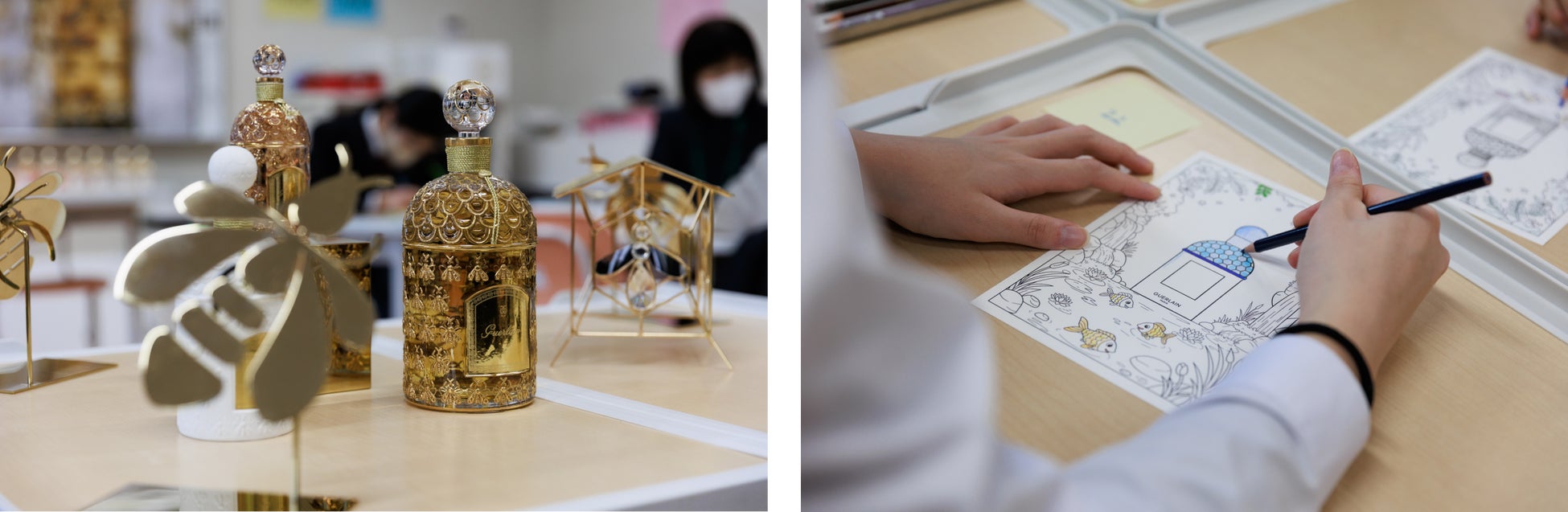 ゲラン: 「ミツバチと共に世界を知ろう」をテーマに、約200年受け継がれた伝統と革新のサヴォアフェールを通じて、フレグランス創作の過程を探究・体験。ミツバチがコスメの原材料をはじめとした植物繁殖に不可欠な「ポリネーター(花粉媒介者)」であること、その保護の重要性を学習し、メゾンのサステナブル フレグランス〈アクア アレゴリア〉の香りとハチミツを楽しみました。