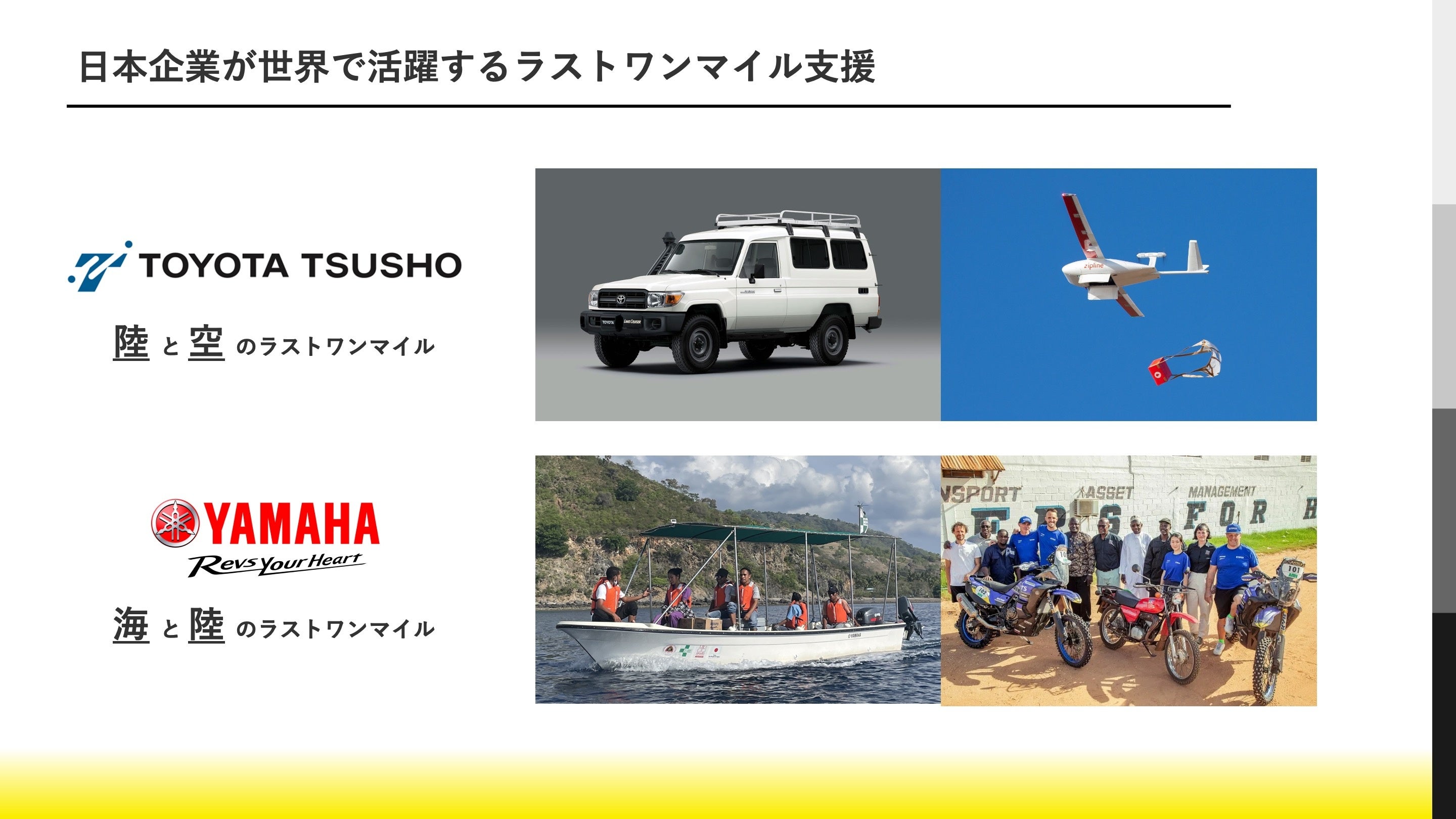 日本では、Ziplineより技術供与を受け、豊田通商の100%出資企業である 「そらいいな」が2022年に事業を開始し、長崎県五島市にて医療用医薬品の輸送と食品・日用品の実験的な輸送をスタートしています。今後もアフリカをはじめとして開発途上国、特に医療課題・グローバルヘルスの課題解決のために努力をしていきたいと思います。