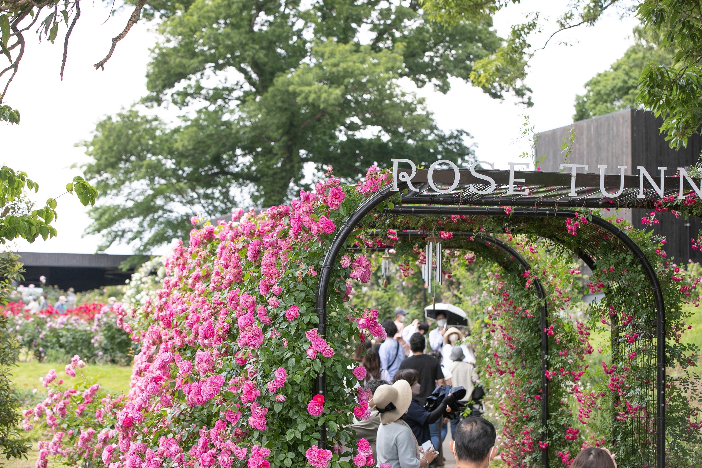 エントランスを抜けて真っ先に視界に飛び込んでくるのは、3年目でようやくバラがアーチを包み込むように覆った「バラのトンネル」。鮮やかなピンク色のバラ「ユイット・カンパーニュ」から始まり、12色のグラデーションで彩られ、華やかな香りで出迎えます。