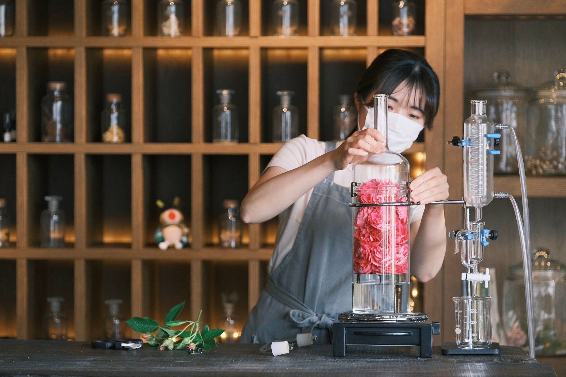 バラシーズン中、園内のガーデンローズを蒸留してバラの香りに包まれるインフォメーション。バラの蒸留水に、お好みの香りのアロマオイルを選んでブレンドし、自分だけのルームミストが簡単に作れます。