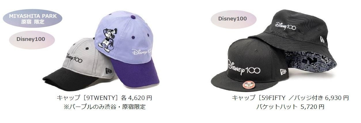 Disney100を記念したNEW ERAキャップは様々なデザインで登場。バケットハットの裏側には楽しげなミッキー&フレンズが勢ぞろい。パープルキャップは渋谷・原宿店限定で発売します。