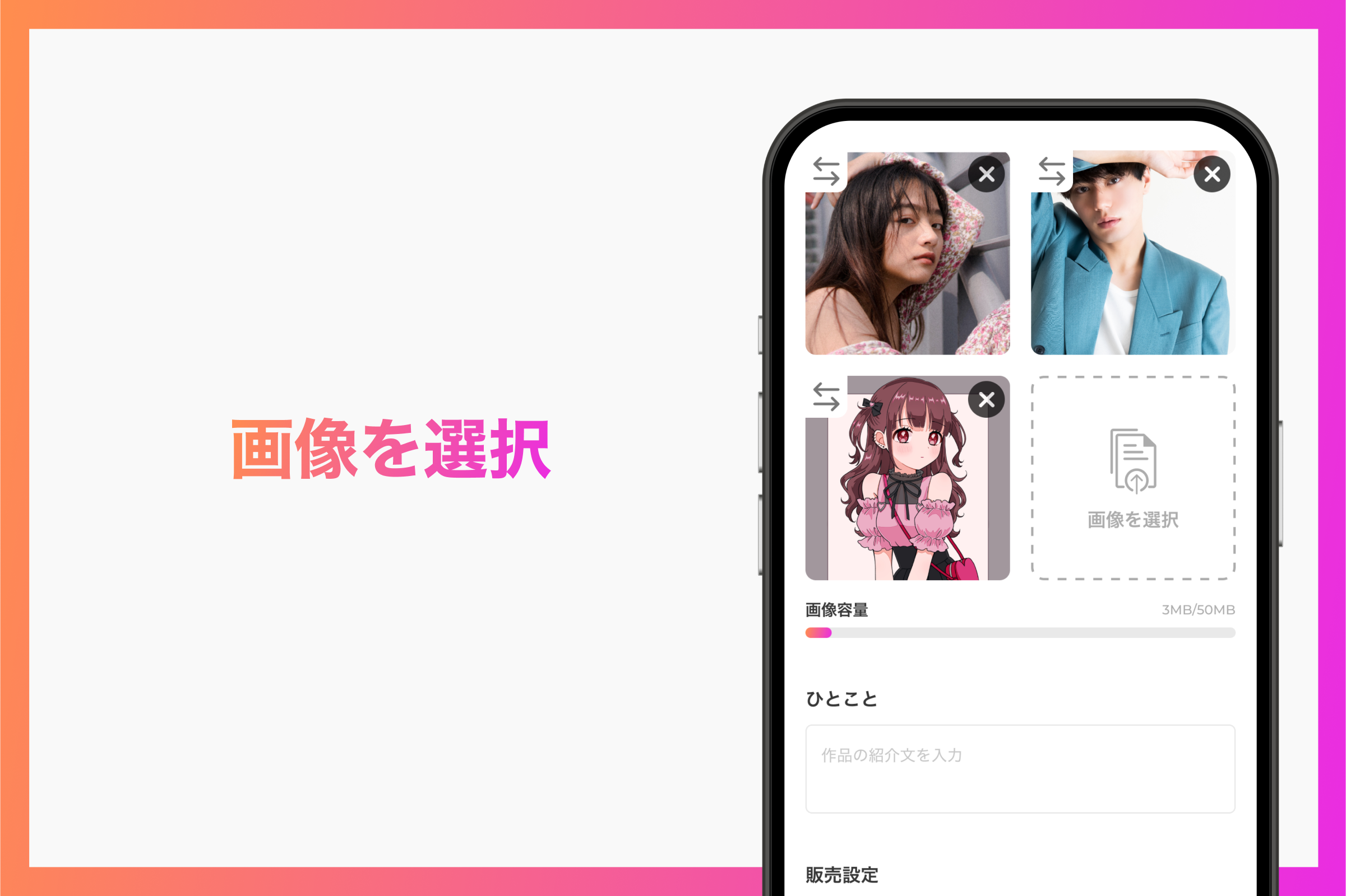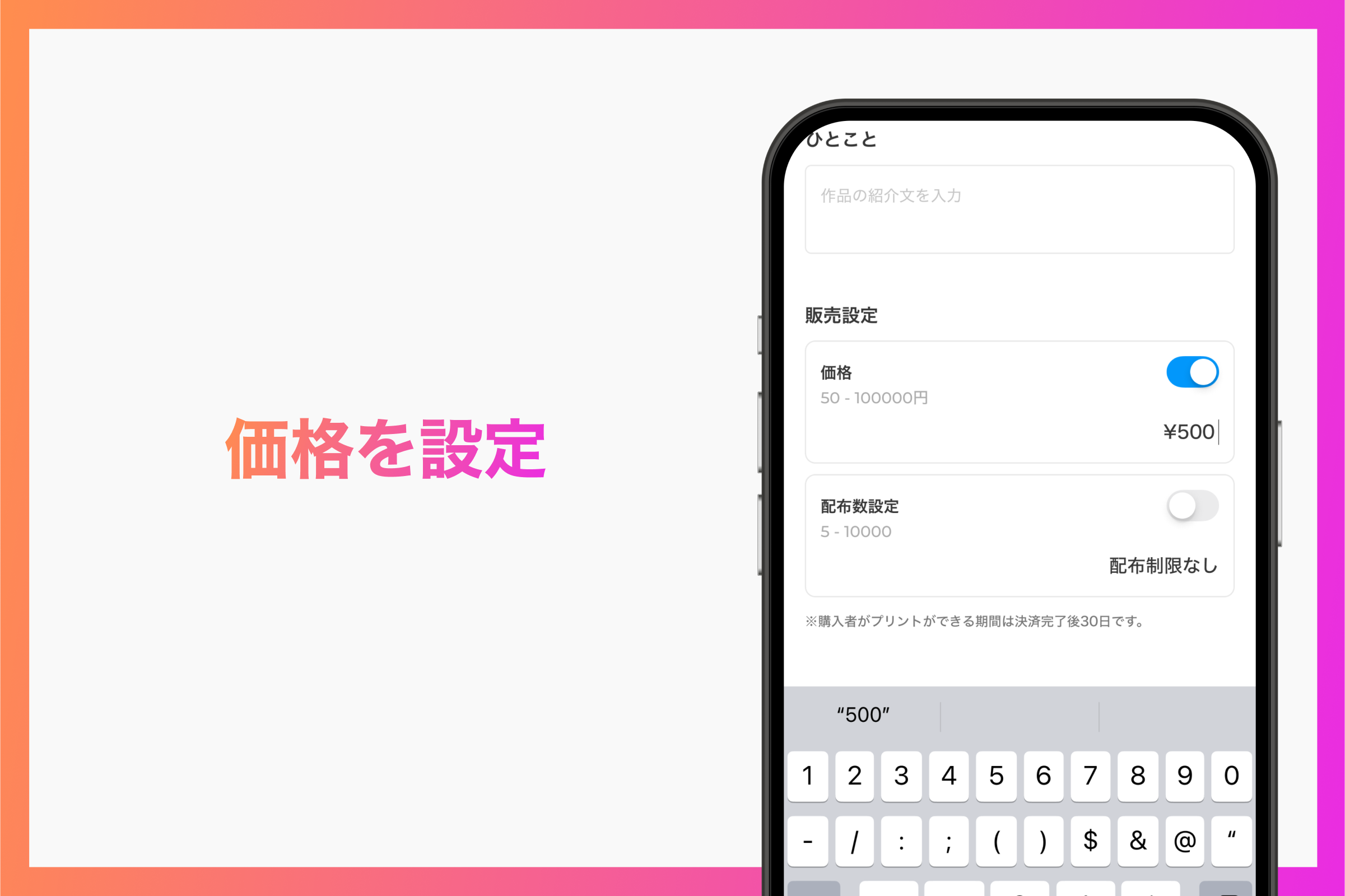 商品の価格は、50円から100,000円の間で設定することができます。※価格を設定しない場合は、商品の無料配布が可能。そのほかにも販売枚数や期間を限定して販売することができますのでシチュエーションにあわせてご利用いただけます。