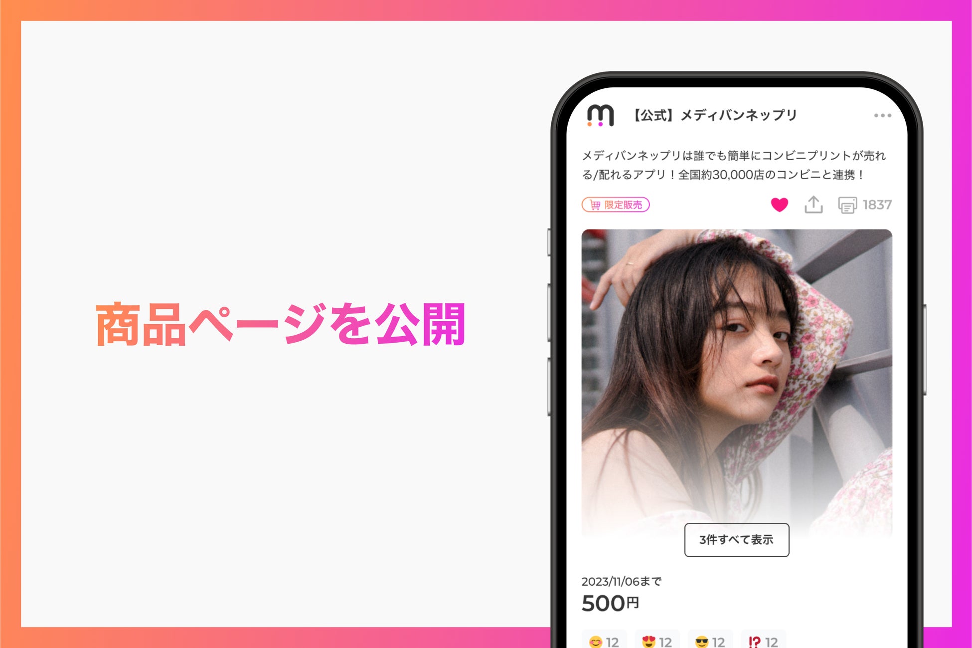 メディバンネップリは写真やイラストを本サービスにアップロードすることで、全国約30,000店のコンビニに設置されたマルチコピー機(※1)を通して、ファンの手に届けることができるアプリです。2023年10月16日より、新たに写真やイラストなどのコンテンツを販売できるサービスを開始いたしました。一般的なコンテンツ/グッズ販売サービスは、在庫管理や発送に加えて手数料が必要となりますが、メディバンネップリは作品を登録して価格を設定するだけで販売できます。また、販売手数料を0円にすることでクリエイター様やコンテンツホルダー様へ可能な限り収益を還元する仕組みをご用意いたしました。コンビニプリントと連携した「メディバンネップリ」でしか体験できない便利な販売機能をお楽しみください。