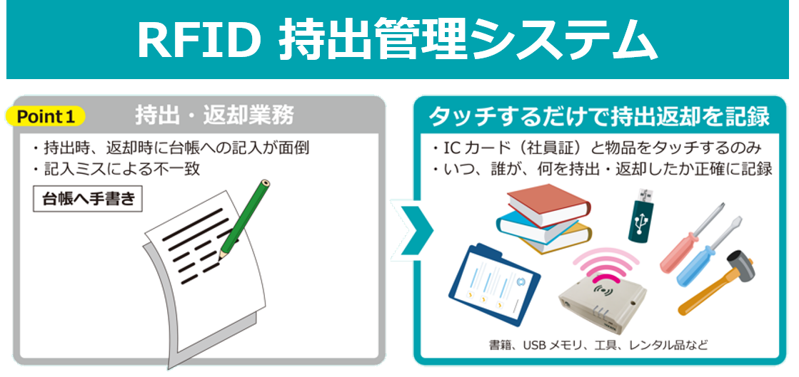 管理物品にICタグを貼付け、RFIDによる持出・返却・棚卸が可能なシステムです。当日は製造業で特にニーズのある工具の持出管理を実演いたします。