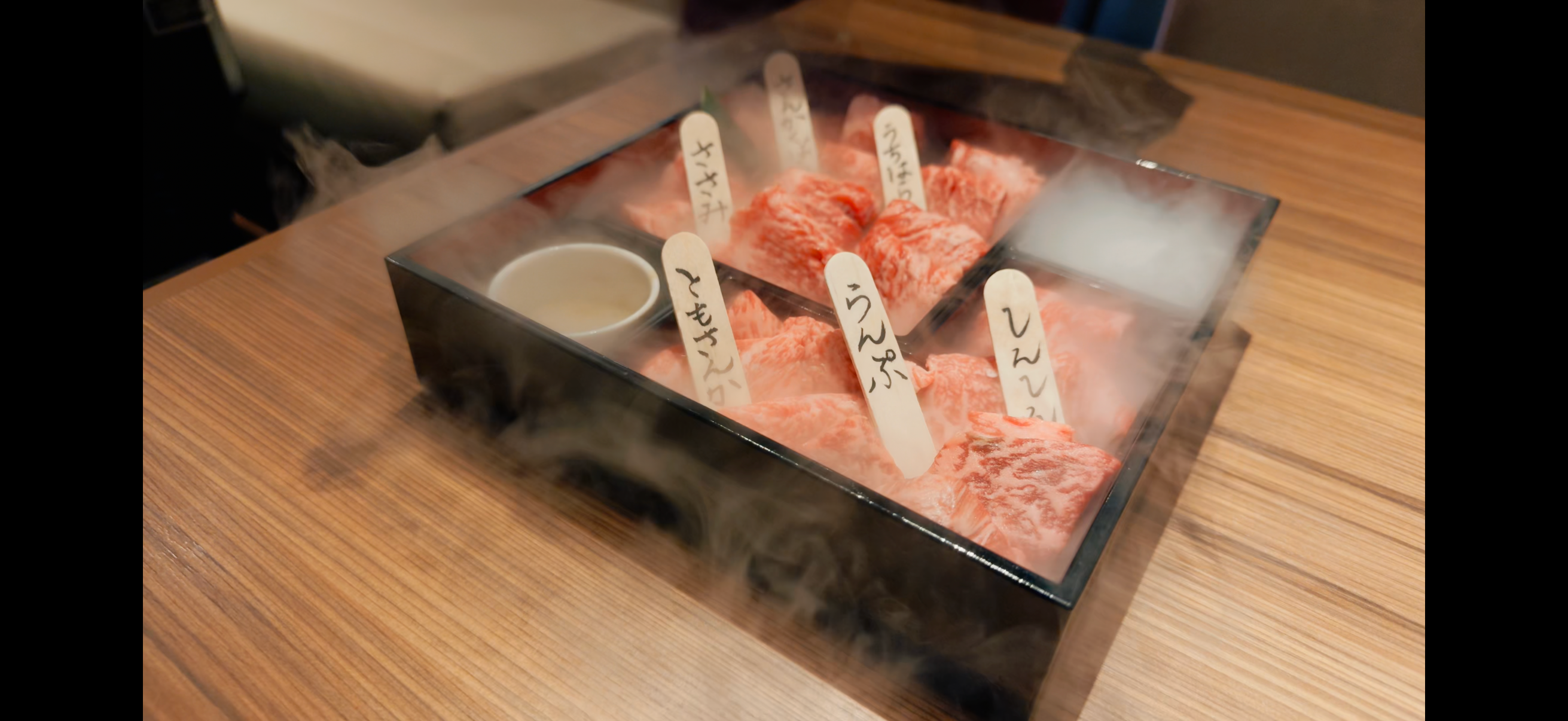 和牛バラの中でも赤身のやわらかさと脂身の旨みを兼ね備えた高級肉の「カイノミ」や霜降りが絶妙な「ササミ」、赤身の旨みが凝縮された「シンシン」や「イチボ」など、その日の希少部位を玉手箱に盛り合わせて提供いたします。開けた瞬間に広がるフォトジェニックな煙と、和牛本来の旨味が凝縮された特別な体験をご提供します。