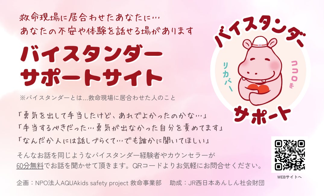 NPO法人AQUAkids safety project 救命事業部(所在地:大阪市中央区 代表者:すがわらえみ)は、JR西日本あんしん社会財団の助成を受け、救命現場に居合わせた人向けにオンラインでメンタルサポートを行う、救命バイスタンダー専用相談窓口「バイスタンダーサポートサイト」を9/9「救急の日」にリリースします。(助成:JR西日本あんしん社会財団)