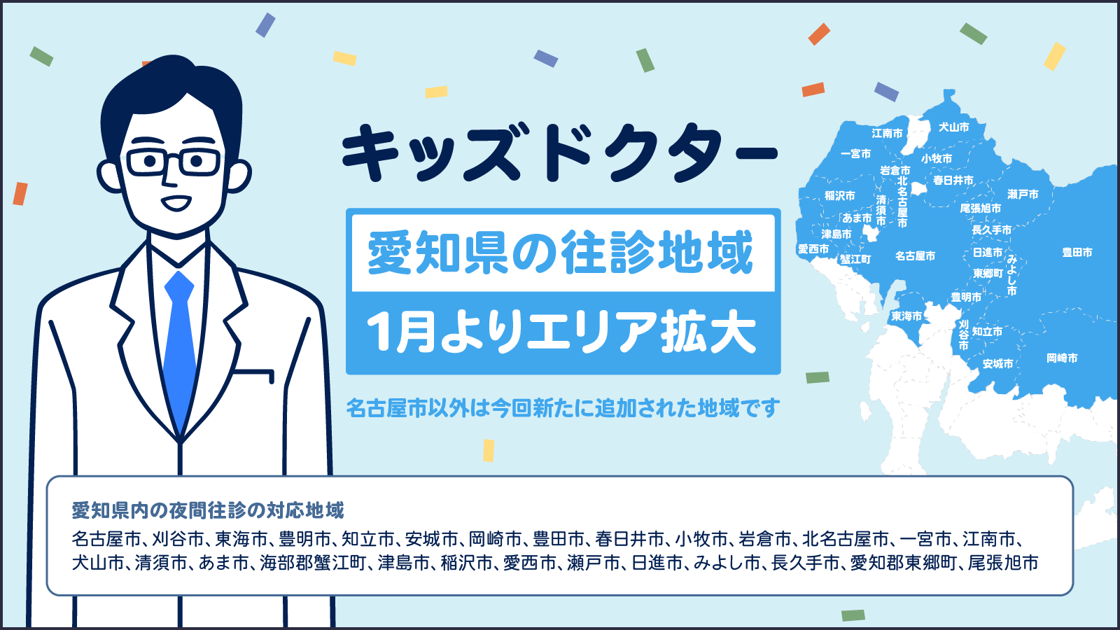 新型コロナの猛威が依然として続いており、子育て中の親御さんにおかれましては、子どもの健康に関するご不安が尽きない状況が続いていらっしゃるかと思います。キッズドクターではそうした親御さんの不安を少しでも和らげられるよう、愛知県での往診サービスの提供エリア拡大を決定するに至りました。