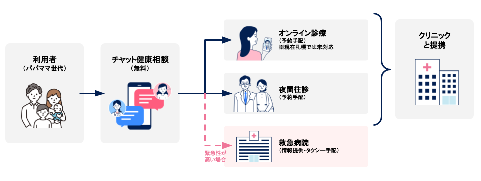 厚労省指針に基づき、病院が空いていない時間に、看護師チームが医学的判断の伴わない一般的な医学的情報の提供や受診勧奨を行います。時間外の病院受診が必要だと判断した場合は、従来の救急病院の情報提供だけではなく、オンライン診療や夜間往診サービスの利用勧奨、近くの救急病院の情報提供及び救急病院へのタクシー配車などを行います。