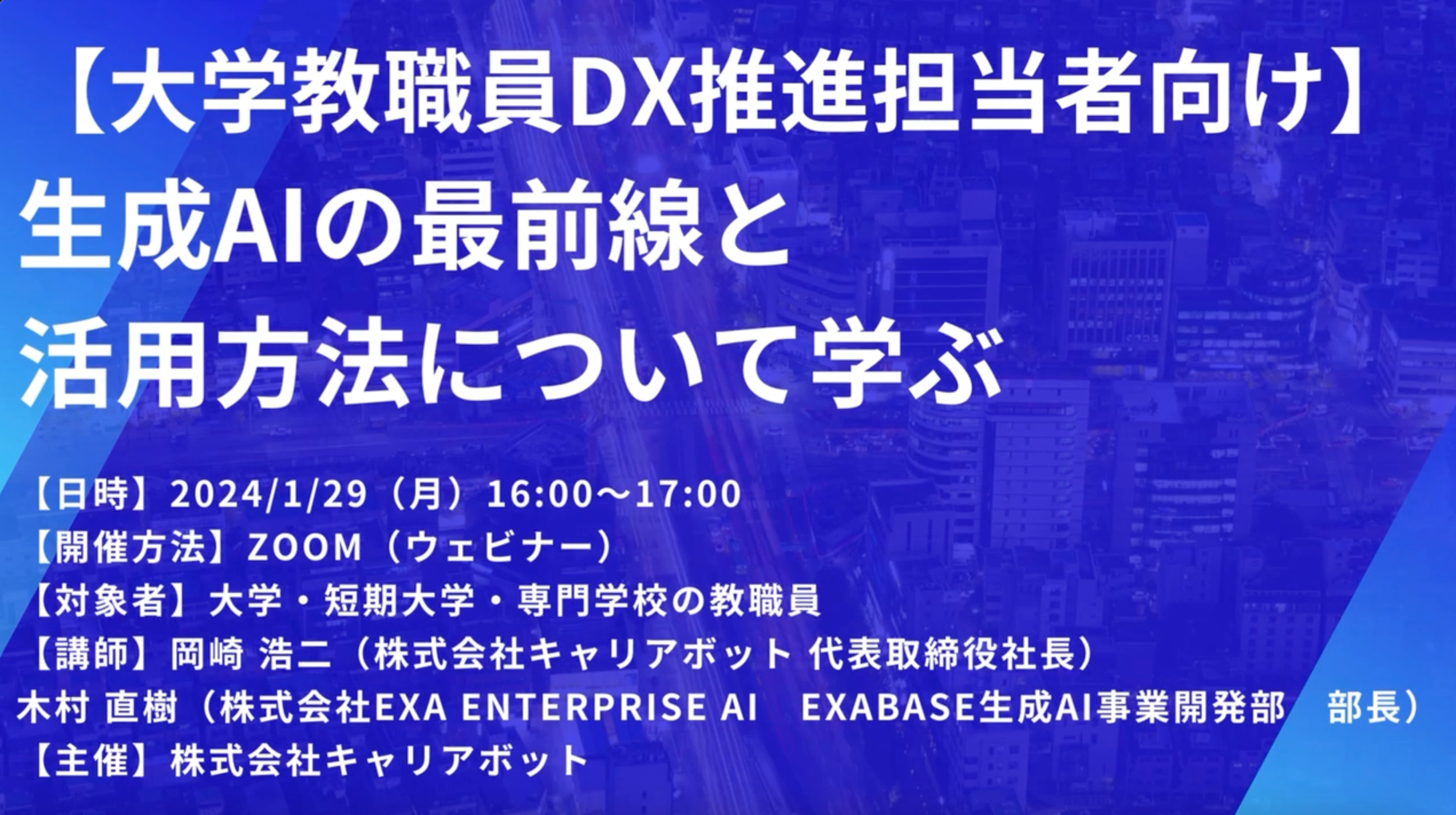 【大学教職員向け】キャリアボット、エクサウィザーズと生成AI活用についてのウェビナーを開催!