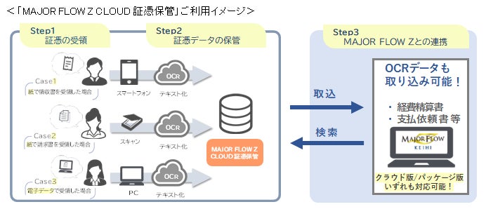 「MAJOR FLOW Z CLOUD 証憑保管」は、スマートフォン・スキャナで読み取った領収書や請求書などのデータ、電子取引で受領した電子データをクラウドにアップロードして保管・管理するサービスです。