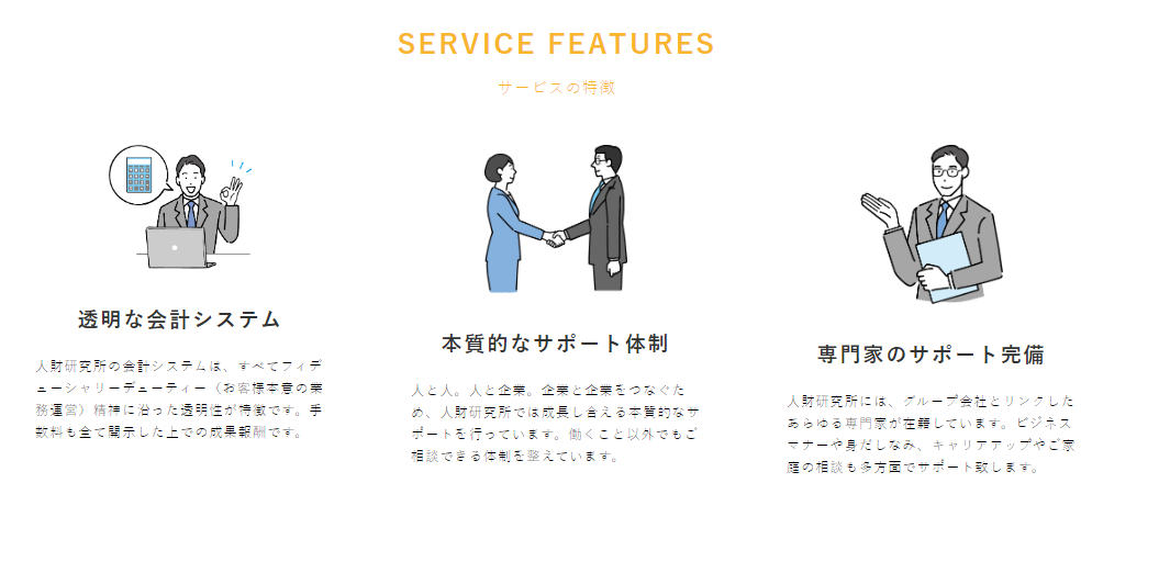 個人と企業へ向けた人財企業マッチング、活躍したいすべての女性に向けた企業マッチングやキャリアアップMUSE講座、結婚のその先もサポートするマリッジMUSE結婚相談など、人と人、人と会社、会社と会社をあらゆる専門家の豊富な知識と経験をもとにしっかりとサポートしていきます。グループ会社では経営コンサルティング事業、不動産事業、金融業、産前産後ケア事業、訪問看護事業を展開しており、これらのグループ会社とリンクしてトータルサポートできるのが特徴です。
