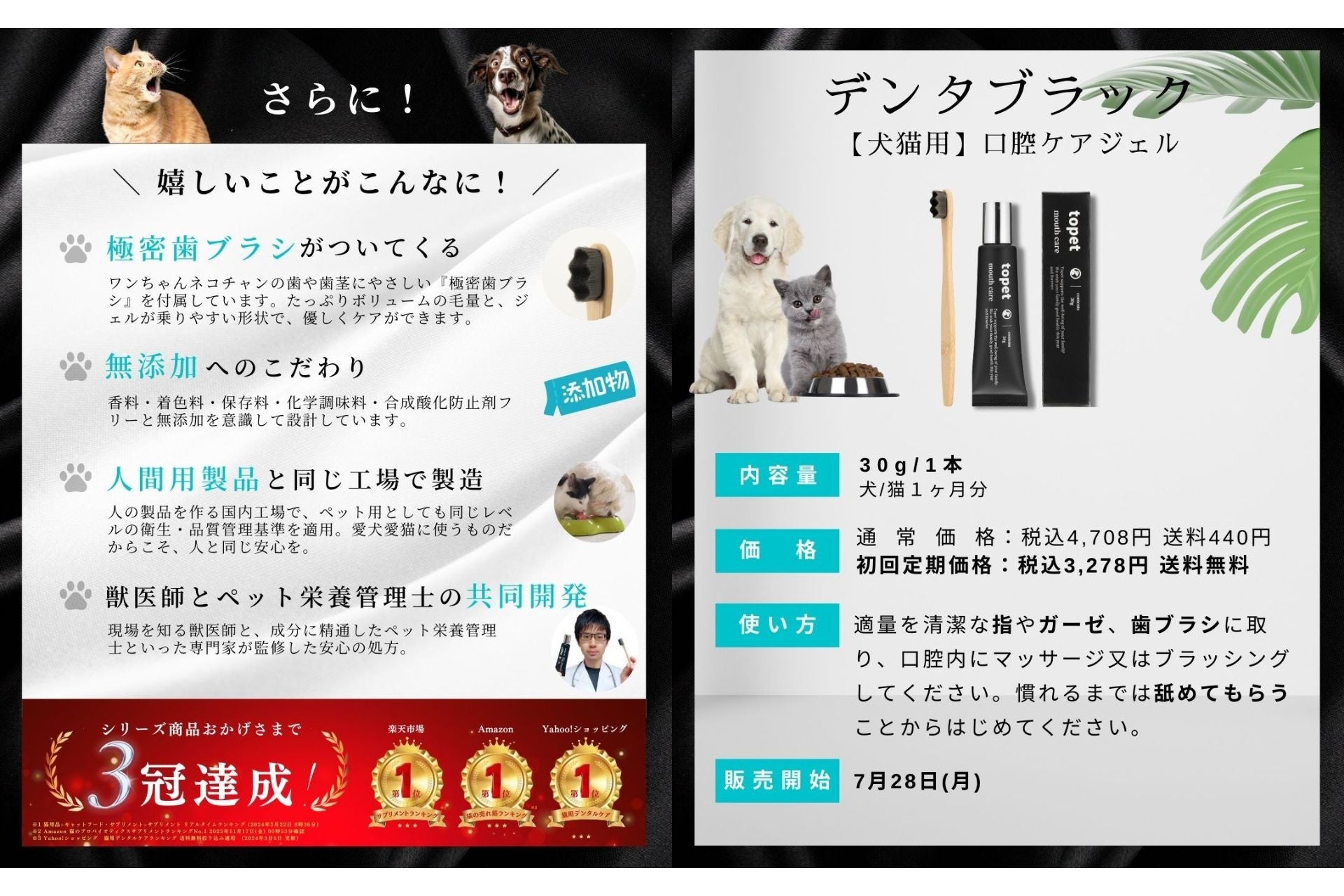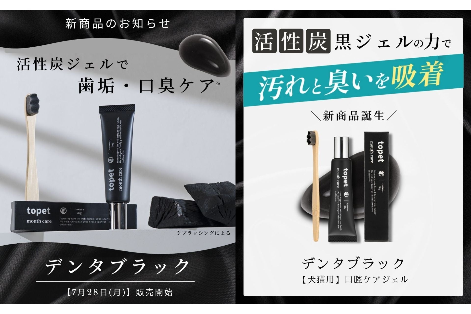 愛犬の歯磨きに悩むすべての飼い主へ。ペットケアブランド「topet(トペット)」は、シリーズ累計500万食を突破(※1)した口腔ケアふりかけ「お口のふりかけ」に続き、黒いジェルタイプの新商品「デンタブラック」を発売します(7月28日(月)発売)。